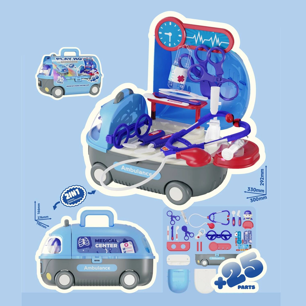 . Thiết kế 2-trong-1 tiện lợi: vừa là xe ô tô đồ chơi, vừa là bộ đồ nghề bác sĩ mini.