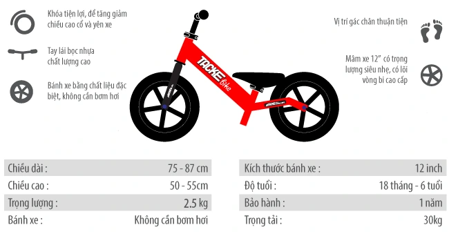 Yên xe: chiều cao được thiết kế tăng giảm dễ dàng nhờ khóa tiện lợi phía dưới yên xe, thuận tiện cho trẻ đang phát triển. Phù hợp bé trai và bé gái từ 18 tháng đến 5 tuổi