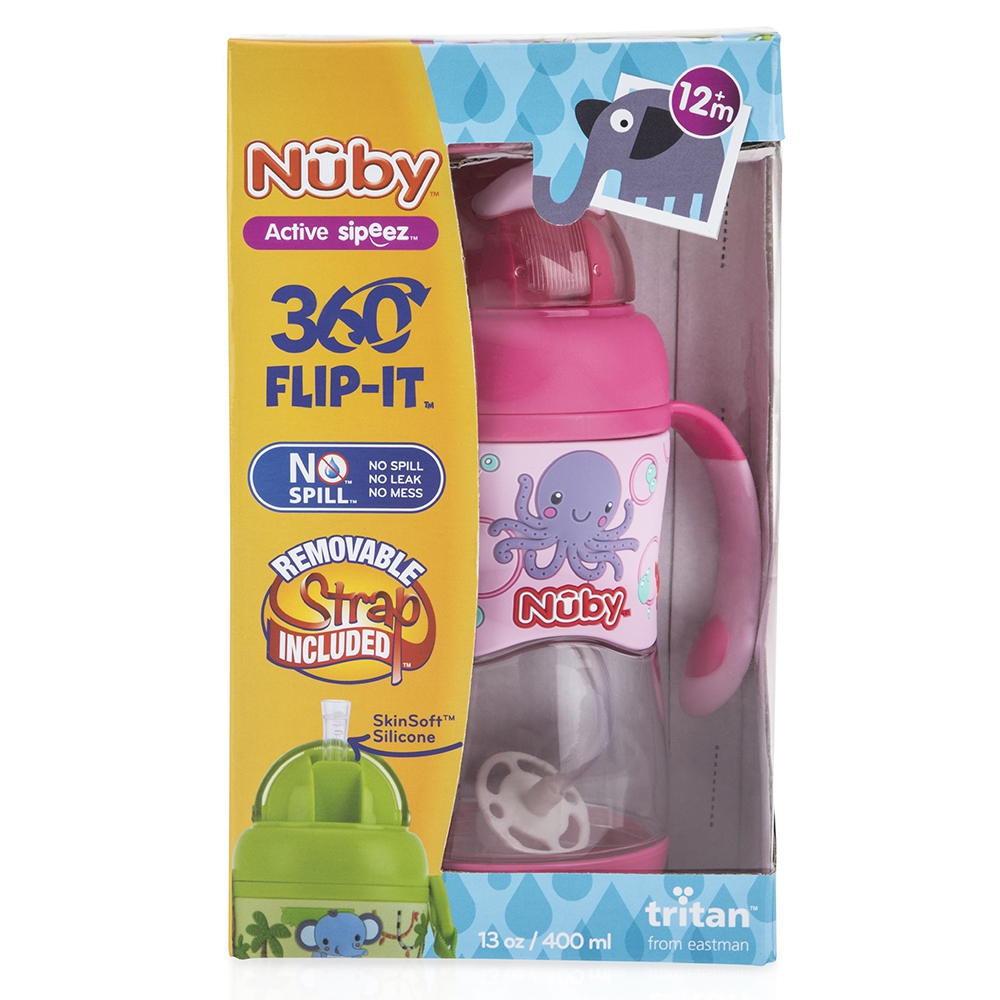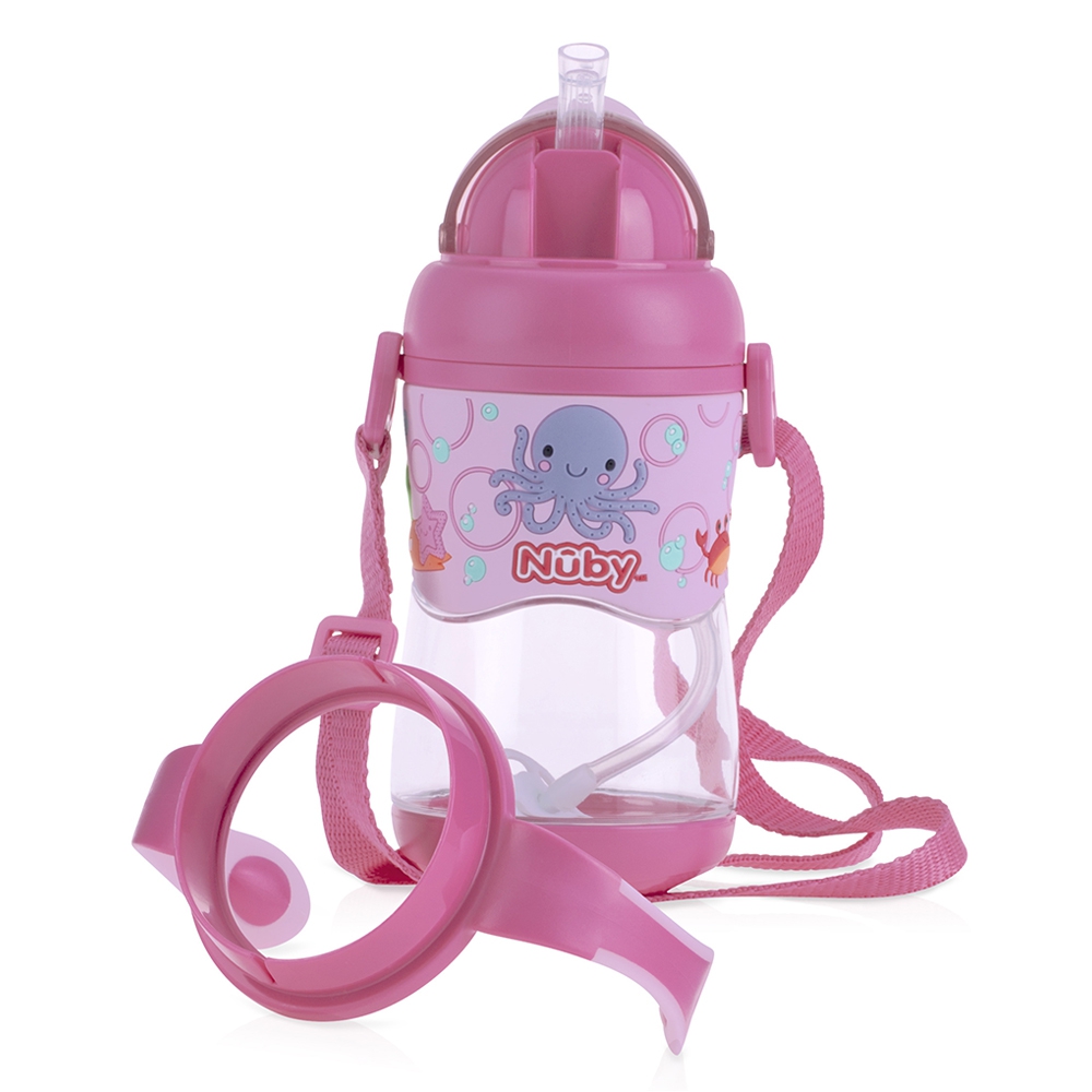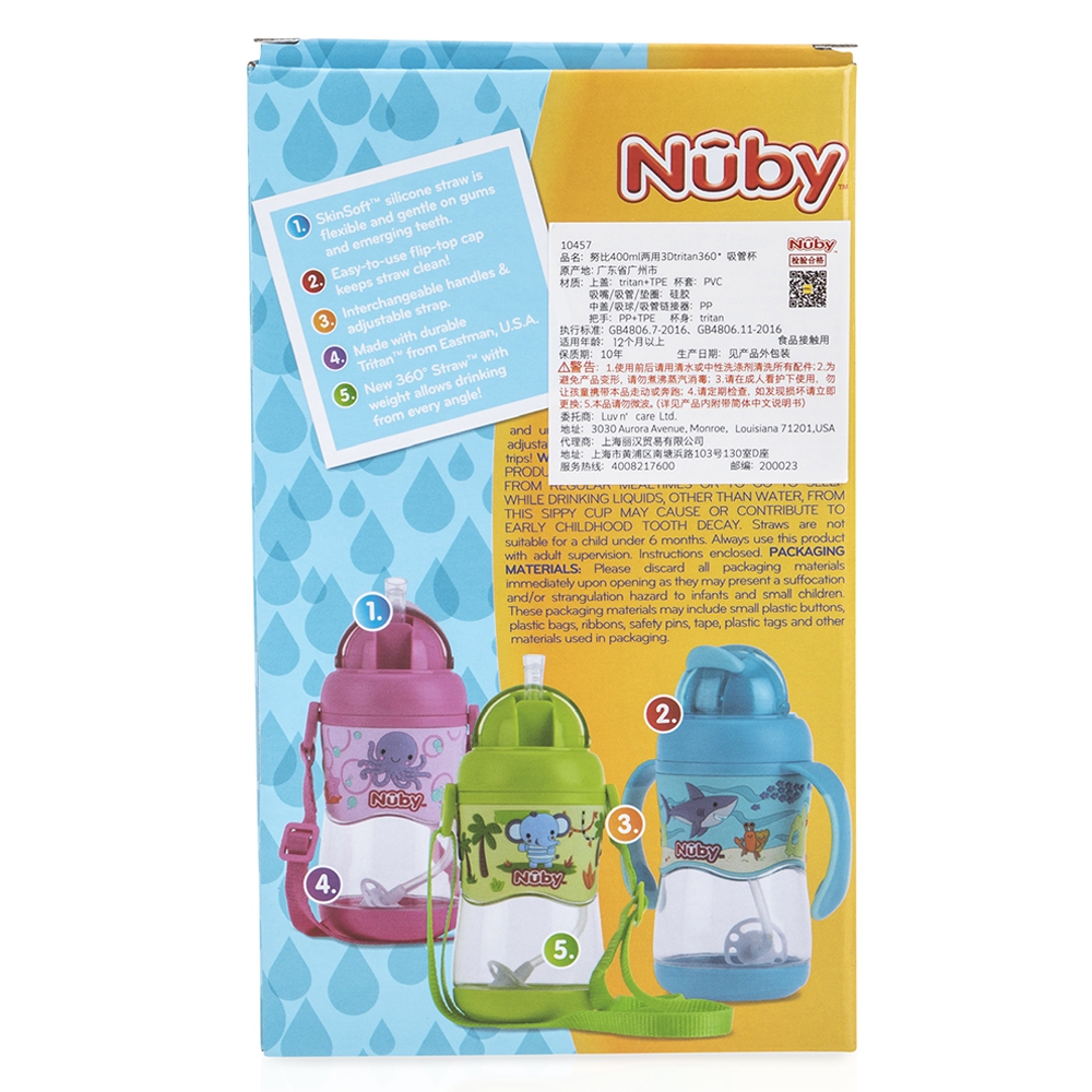 Bình uống nước Tritan Nuby hai tay cầm, 400ml (Hồng) được thiết kế với ống hút 360 độ cho bé thỏa thích uống nước ở mọi tư thế một cách thoải mái