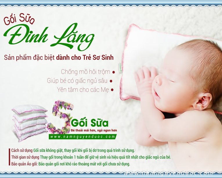 Nam Nguyên Dược đã nghiêng cứu kỹ lưỡng để cho ra đời dòng sản phẩm Gối Sữa chuyên dành cho trẻ sơ sinh, nhằm bảo vệ giấc ngủ cho trẻ trong giai đoạn này. Gối Sữa Đinh Lăng chống mồ hôi trộm cho bé khi ngủ, Giúp bé có giấc ngủ sâu từ đó các Mẹ yên tâm hơn khi chăm sóc giấc ngủ cho bé.