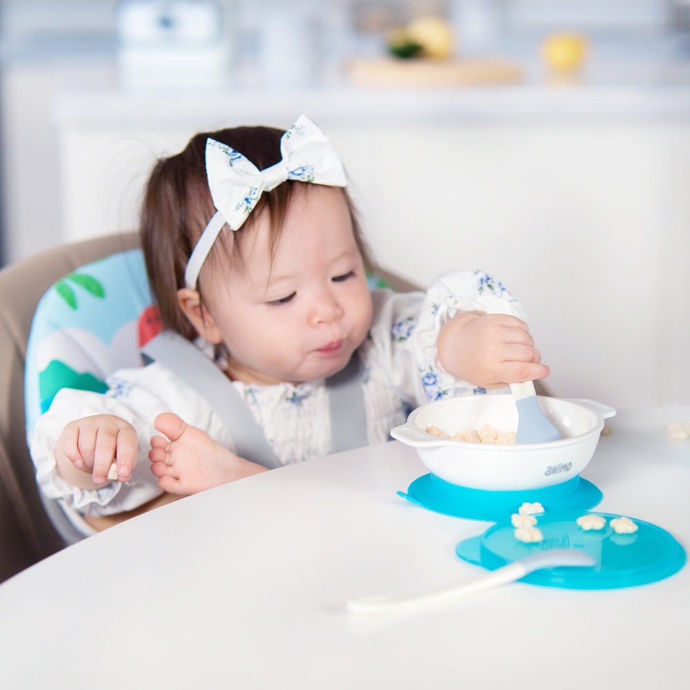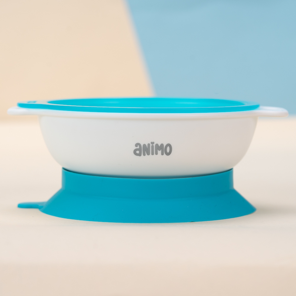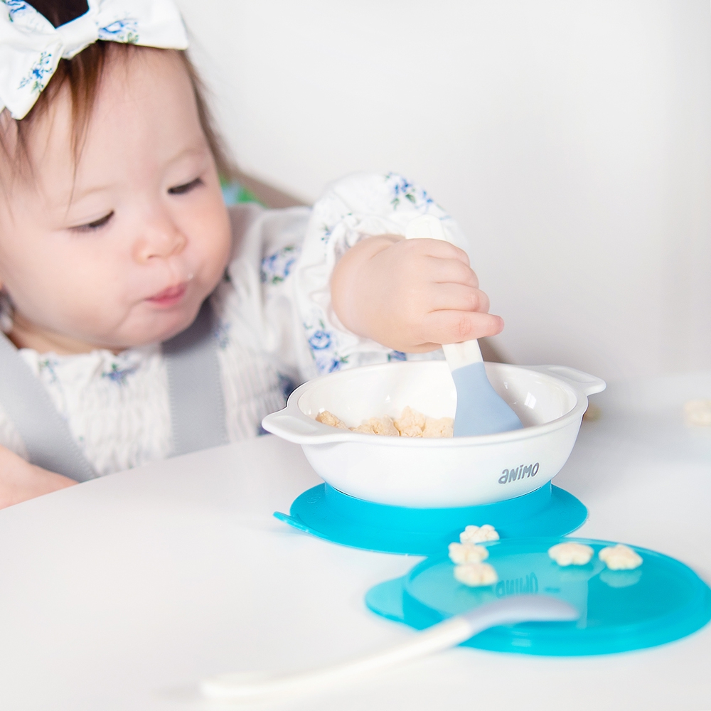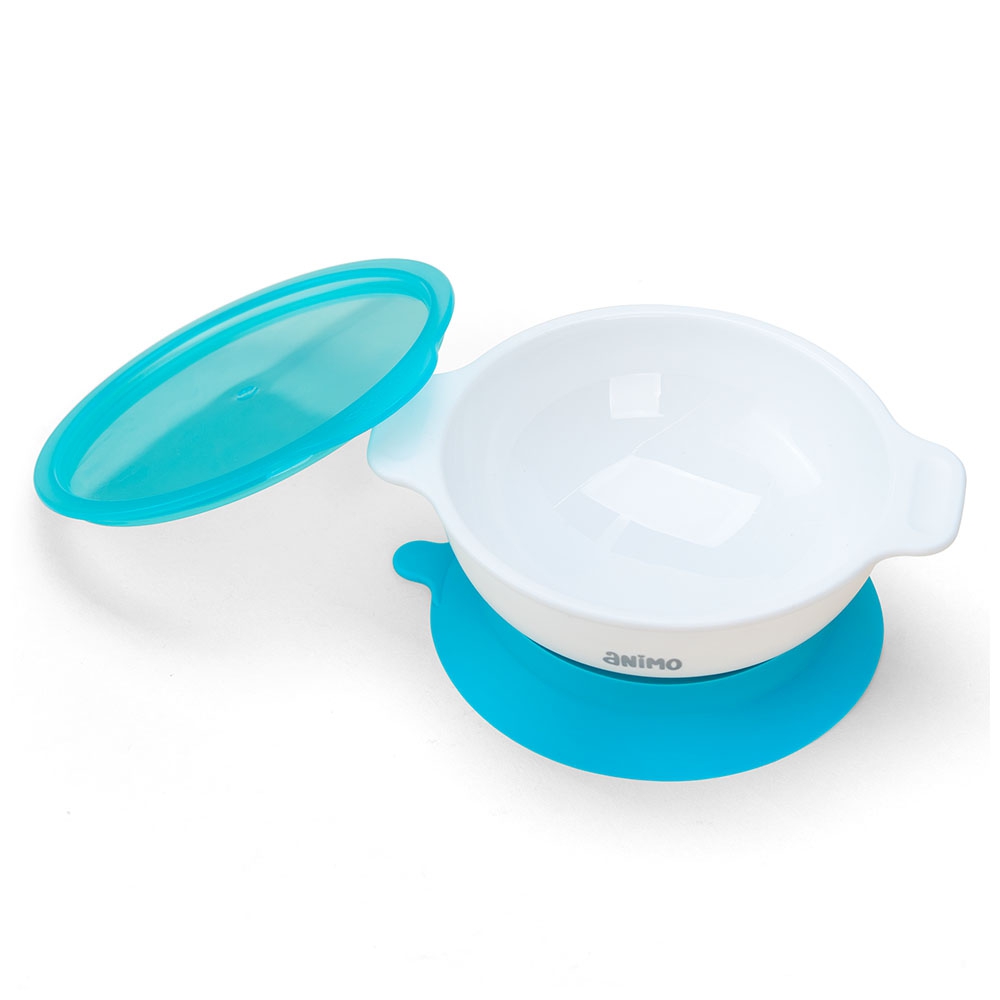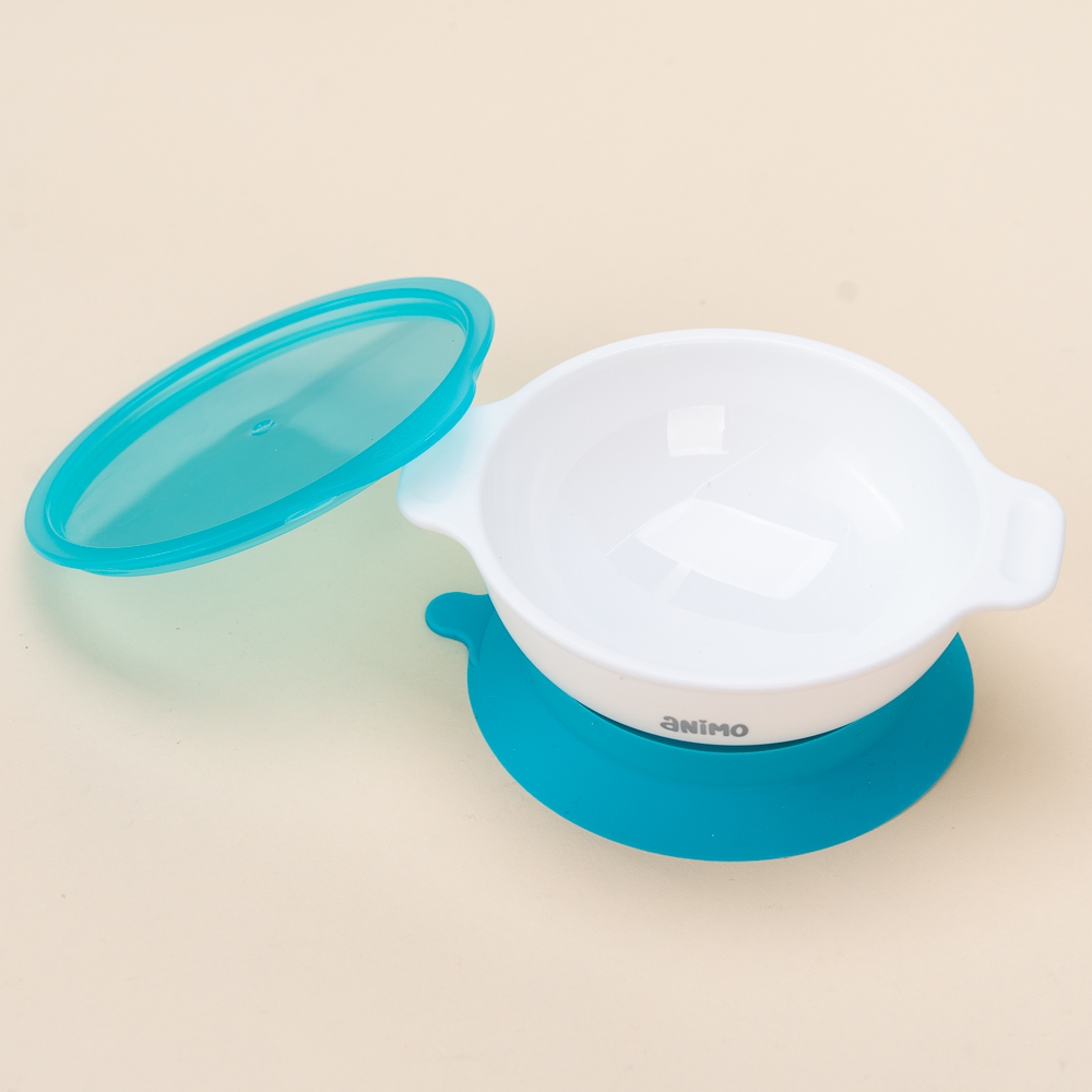 Bát ăn dặm chống trượt kèm nắp Animo (250ml, RKC1008, xanh) phù hợp với bé từ 6 tháng tuổi. Sản phẩm có đáy chống trượt thông minh, tay cầm và nắp đậy tiện lợi để chứa đựng thực phẩm.