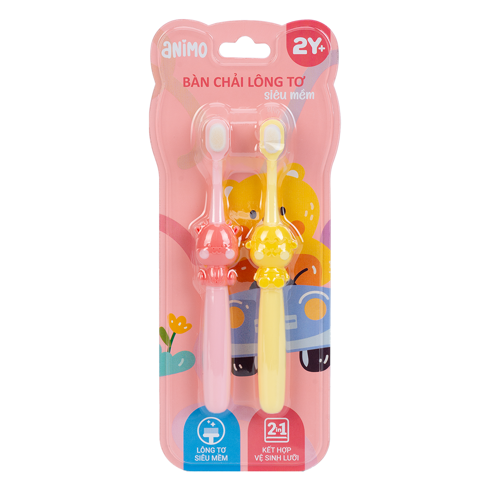 Bộ 2 bàn chải lông tơ Animo phù hợp với bé từ 2 tuổi. Sản phẩm có thiết kế tay cầm dễ cầm nắm, giúp bé dễ dàng làm quen và vệ sinh răng miệng mỗi ngày.