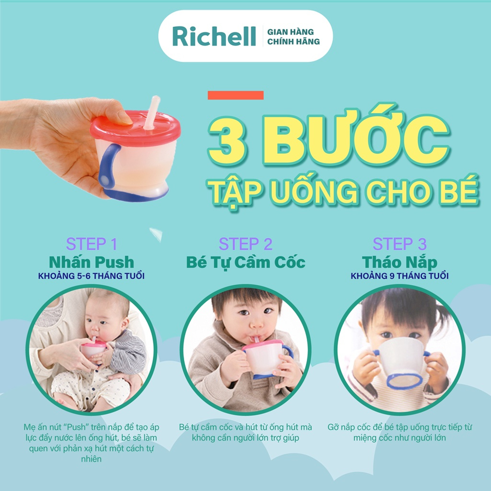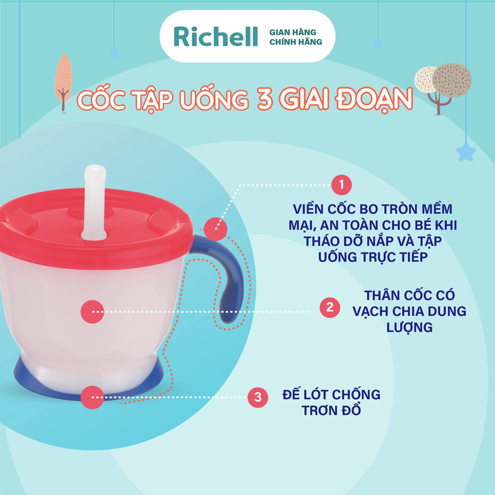 Cốc tập uống 3 giai đoạn Richell sở hữu thiết kế thông minh phù hợp với từng giai đoạn phát triển của trẻ nhỏ: