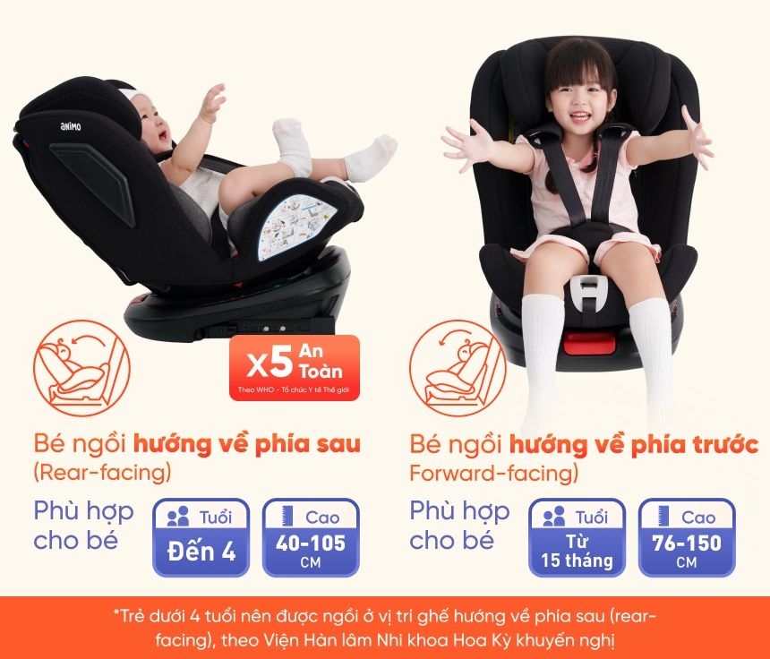 . Tư thế quay về trước: Lắp ghế bằng hệ thống Isofix kết hợp với dây an toàn của xe ô tô.
