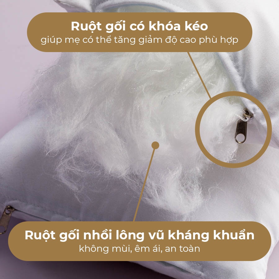 Ruột gối nhồi lông vũ nguyên sinh, kháng khuẩn không mùi, êm ái mềm mại, an toàn tuyệt đối cho bé nằm thoải mái không mỏi người. Thiết kế tinh tế thông minh với khóe dây kéo ruột gối, giúp mẹ có thể tùy ý điều chỉnh độ cao gối, cho bé một giấc ngủ thoải mái nhất.