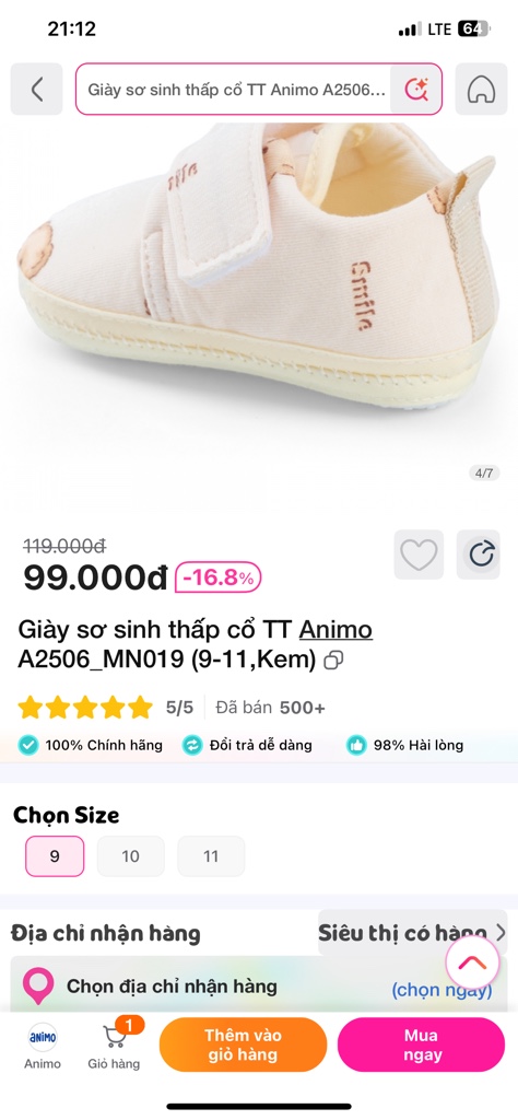 Giày sơ sinh thấp cổ TT Animo A2506_MN019 (9-11,Kem)