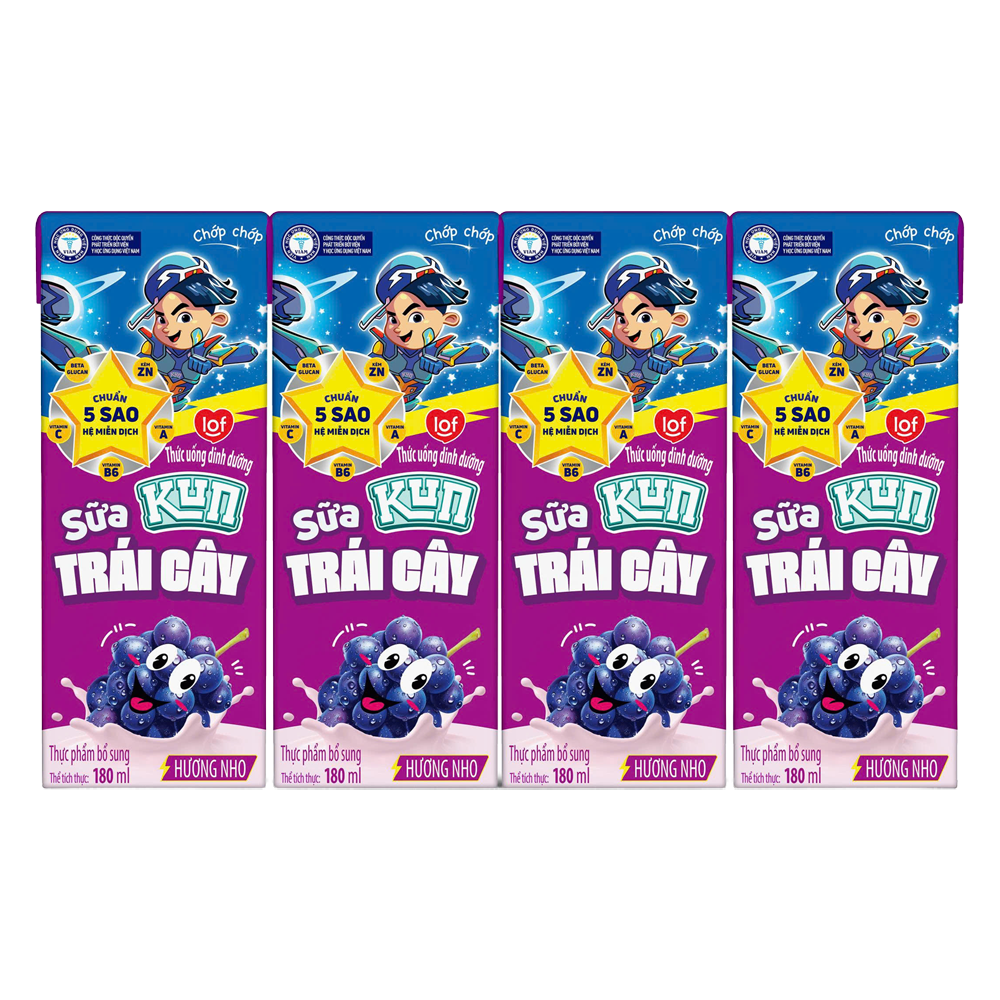 | Tên sản phẩm | Sữa trái cây Kun hương nho 180ml (lốc 4 hộp) |