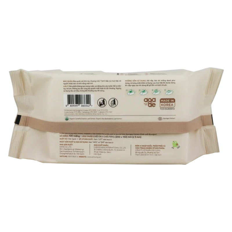 | Thành phần | Vải không dệt, nước tinh khiết, tinh chất lô hội và trà xanh, Phytoncide - Chất kháng khuẩn tự nhiên, Caprylyl Glycol |
