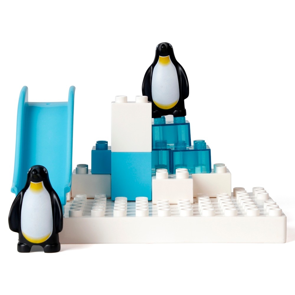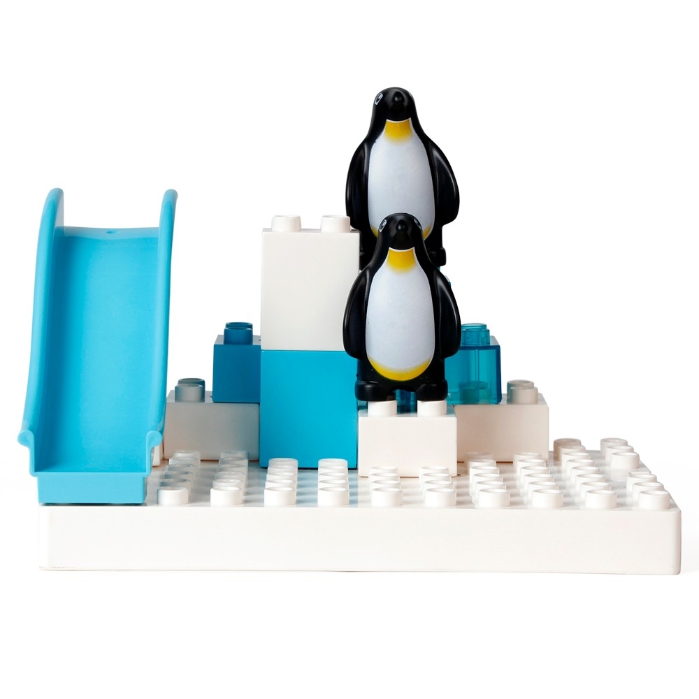- Hình ảnh chú chim cánh cụt, cầu trượt, khối xếp màu trắng giúp bé nhận biết tên con vật, nhận biết màu sắc.