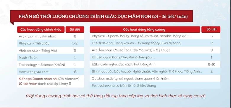 Bảng phân bổ thời lượng chương trình giáo dục mầm non (Nguồn: Website trường)