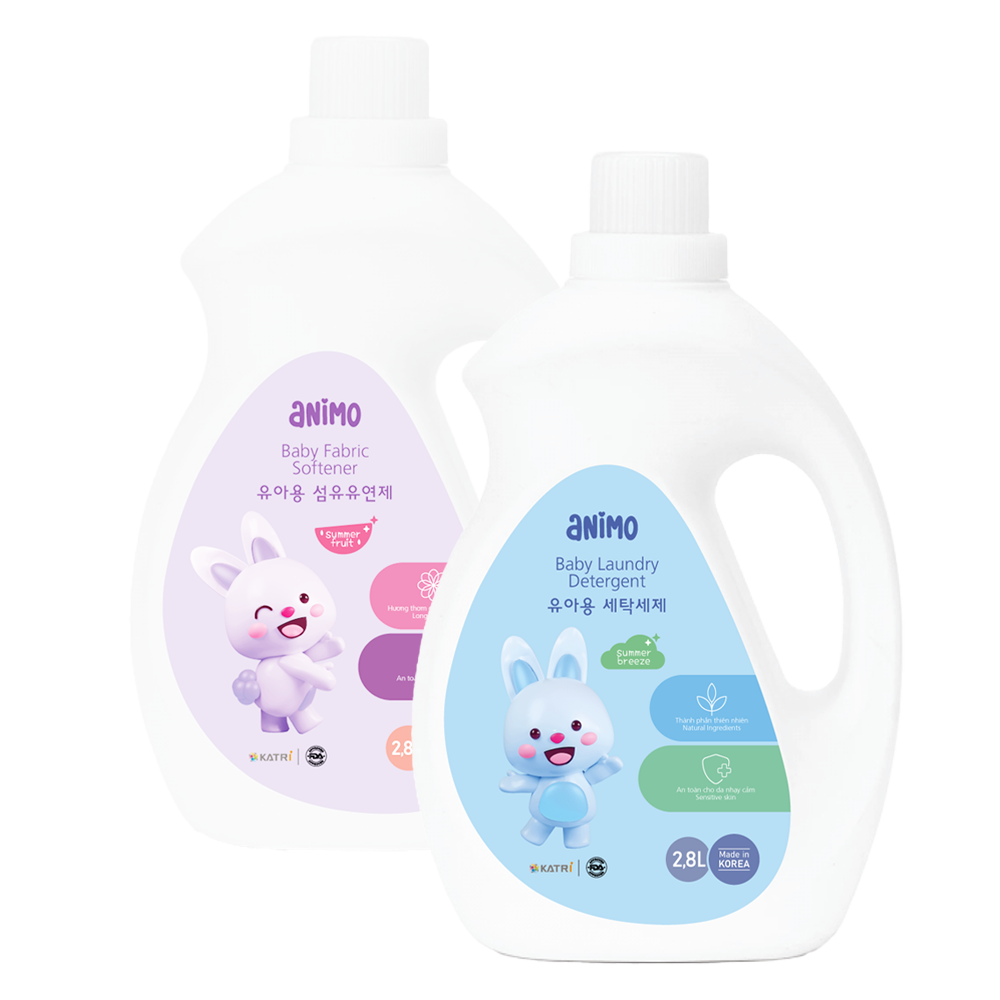 Combo 1 Nước giặt cho bé Animo hương làn gió mùa hè chai 2,8L và 1 Nước xả cho bé Animo hương trái cây mùa hè chai 2,8L