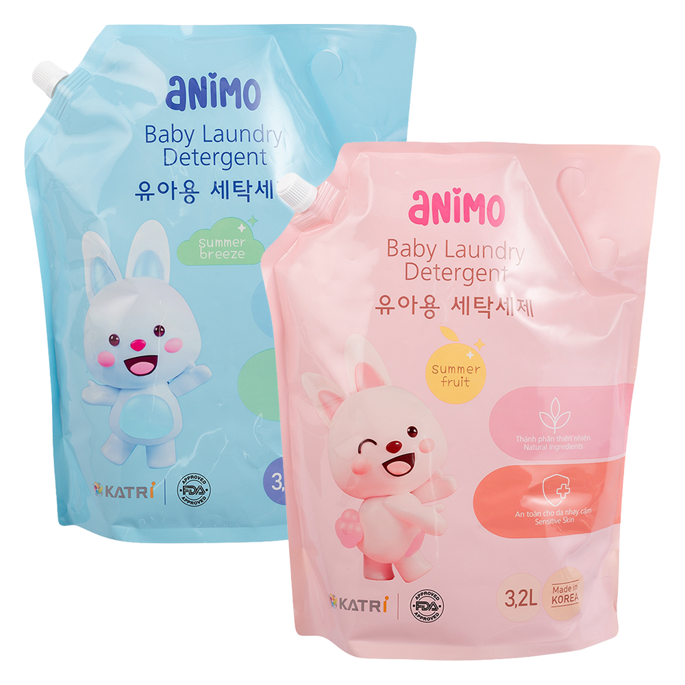 Combo 1 Nước giặt cho bé Animo hương trái cây mùa hè túi refill và 1 Nước giặt cho bé Animo hương làn gió mùa hè túi refill 3,2L