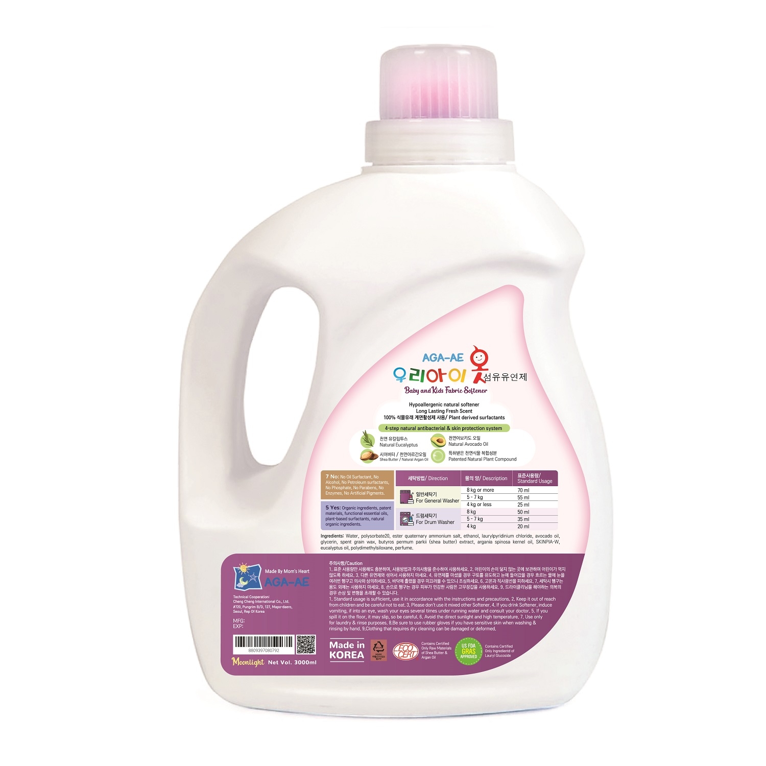 Combo 2 Nước xả làm mềm vải Hàn quốc AGA - AE kháng khuẩn & bảo vệ da bé - Moonlight 3L