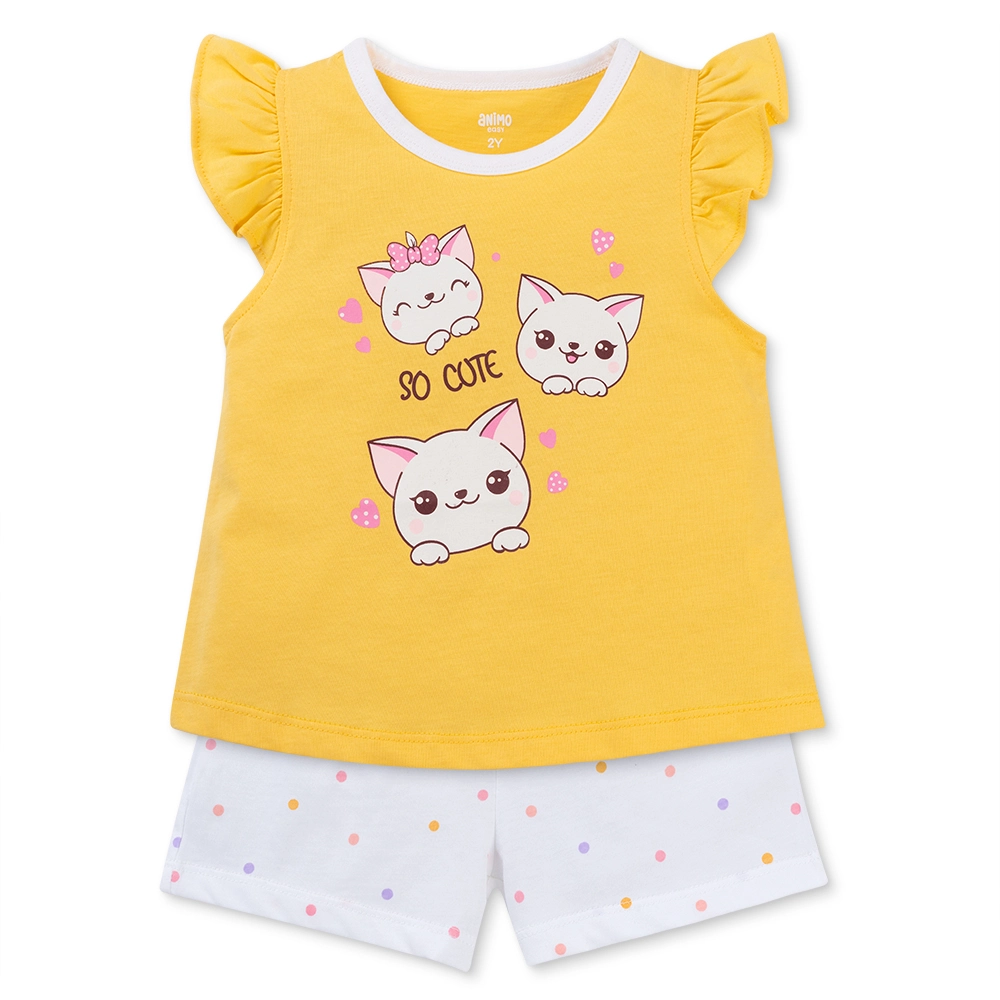 Bộ bé gái ngắn Animo Easy TX0226017 gây ấn tượng với áo vàng tươi in hình mèo “So Cute” kết hợp quần trắng chấm bi nhẹ nhàng. Thiết kế tay bèo đáng yêu, chất liệu cotton mềm mát, cho bé thoải mái vui chơi mỗi ngày.