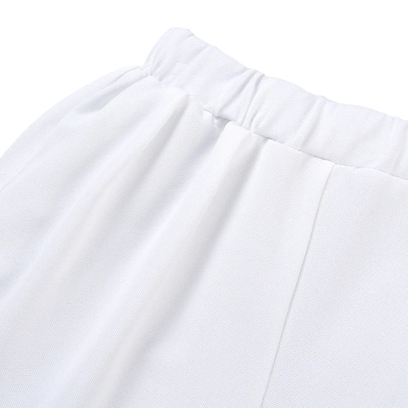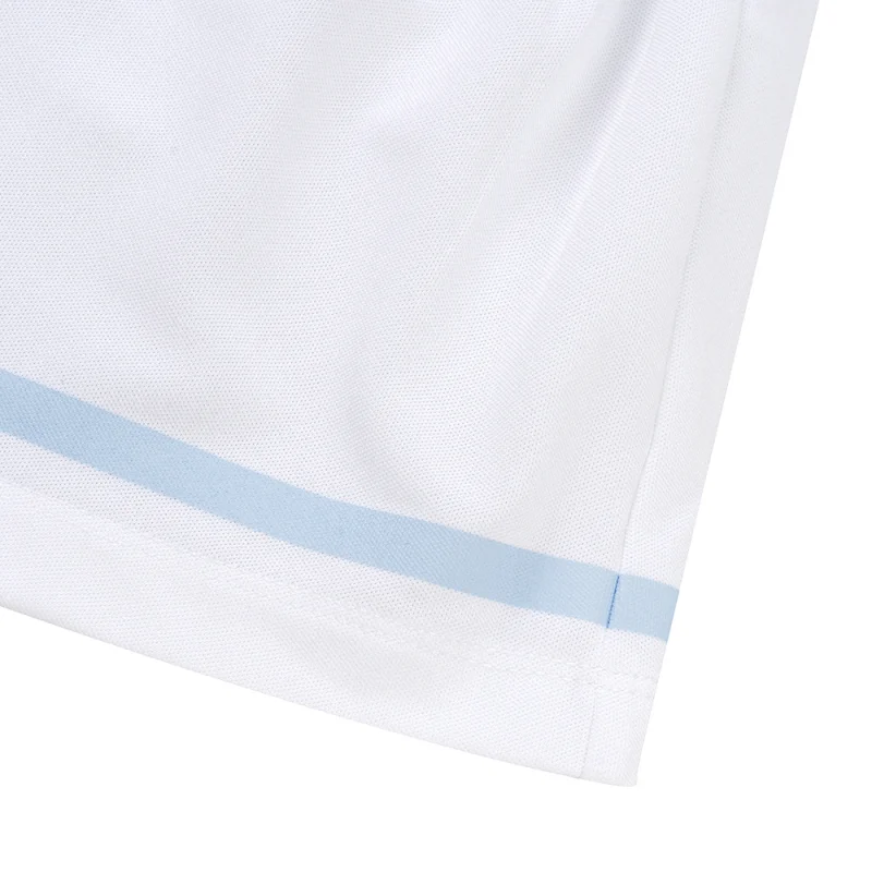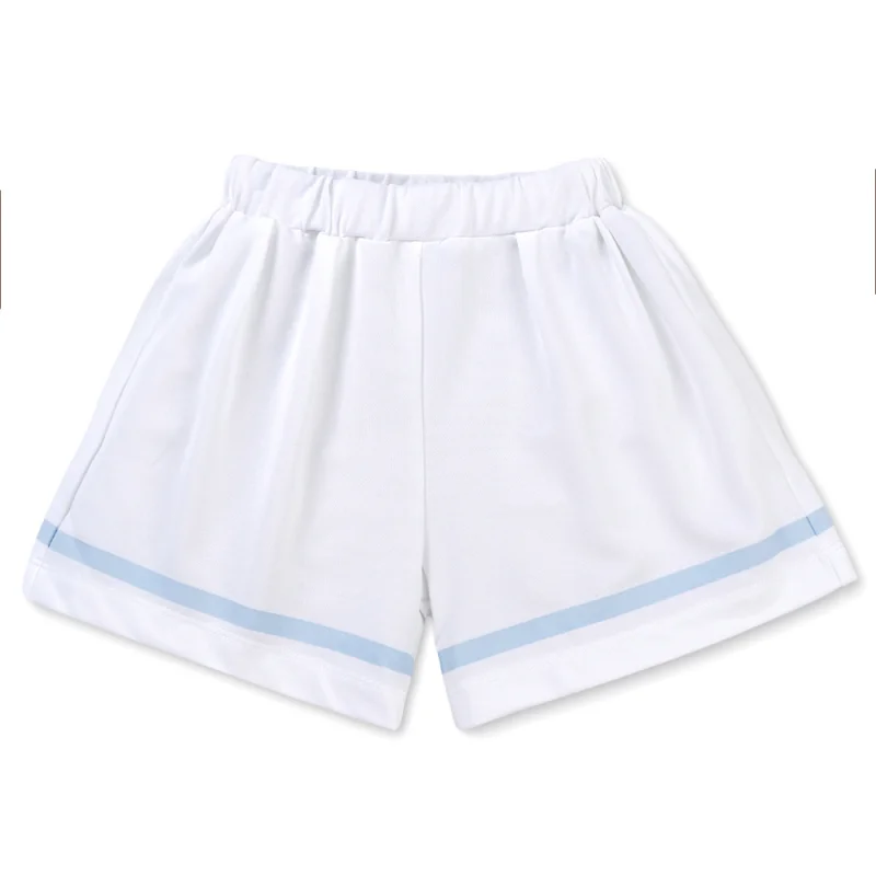 * Quần ngắn màu trắng có viền xanh đồng bộ, thiết kế lưng thun co giãn giúp bé thoải mái vận động cả ngày.