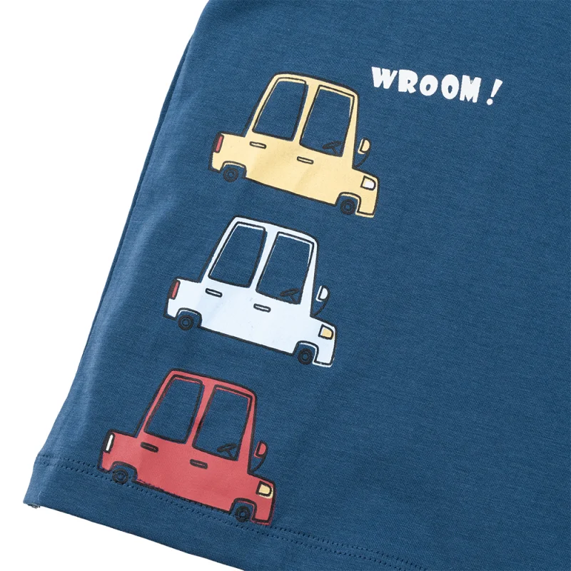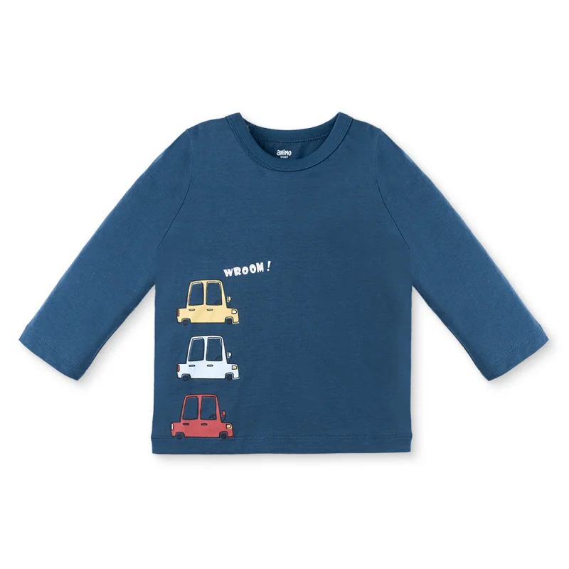 . Áo dài tay màu xanh dương đậm nổi bật với họa tiết in 3 chiếc ô tô xếp chồng lên nhau cùng dòng chữ "WROOM!" vui nhộn, phù hợp với sở thích của các bé trai.