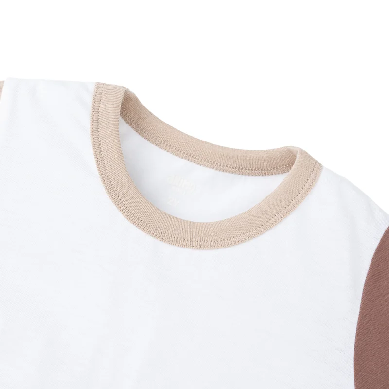 . Tông màu Trắng phối Nâu mang đậm phong cách Hàn Quốc, tạo vẻ ngoài "tây", sạch sẽ và cực kỳ tôn da cho các bé trai.
