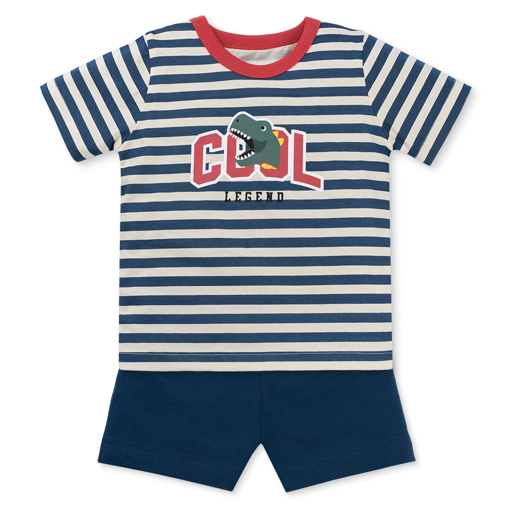 2. Đặc điểm thiết kế: Sản phẩm gây ấn tượng với họa tiết kẻ sọc ngang màu xanh dương đậm trên nền vải kem sáng, tạo cảm giác thanh lịch nhưng vẫn rất năng động. Điểm nhấn "đắt giá" của chiếc áo là hình ảnh chú khủng long xanh cá tính cùng dòng chữ "COOL LEGEND" được in sắc nét ở chính giữa ngực. Sự kết hợp độc đáo giữa bo viền cổ áo màu đỏ và quần đùi xanh dương đậm tạo nên một tổng thể màu sắc hài hòa và bắt mắt. Form dáng suông vừa vặn cùng lưng thun quần co giãn giúp bé thoải mái trong mọi cử động.