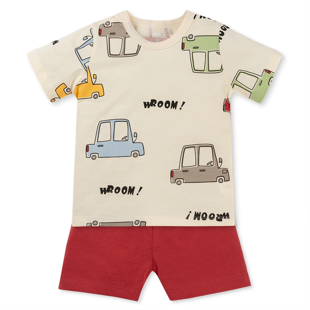 2. Đặc điểm thiết kế: Sản phẩm gây chú ý với thiết kế áo phông màu kem được in tràn toàn bộ họa tiết những chiếc xe hơi đa sắc màu (vàng, xanh, đỏ, xám) cùng dòng chữ "WROOM!" vui nhộn. Kiểu in tràn này không chỉ tạo điểm nhấn độc đáo mà còn giúp bé trông thời thượng như một "fashionista" nhí. Đi kèm là chiếc quần ngắn màu đỏ đô đồng điệu với các chi tiết trên áo, tạo nên một tổng thể vô cùng hài hòa và bắt mắt. Các đường may được chăm chút tỉ mỉ, bo viền cổ áo chắc chắn giúp sản phẩm giữ được form dáng chuẩn sau nhiều lần sử dụng.