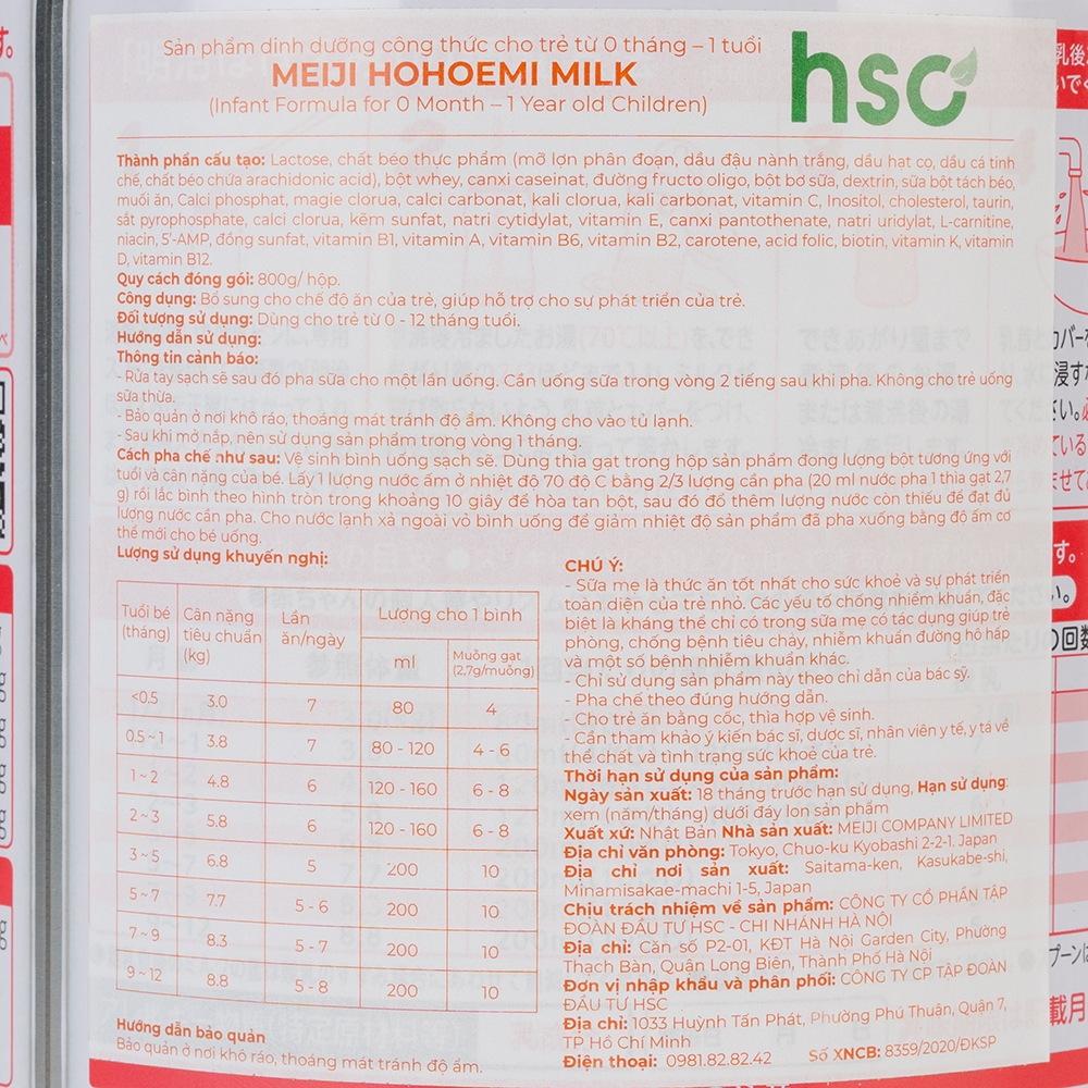 | Tên sản phẩm | Sữa Meiji nội địa Hohoemi, 0 - 1 tuổi, 800G |