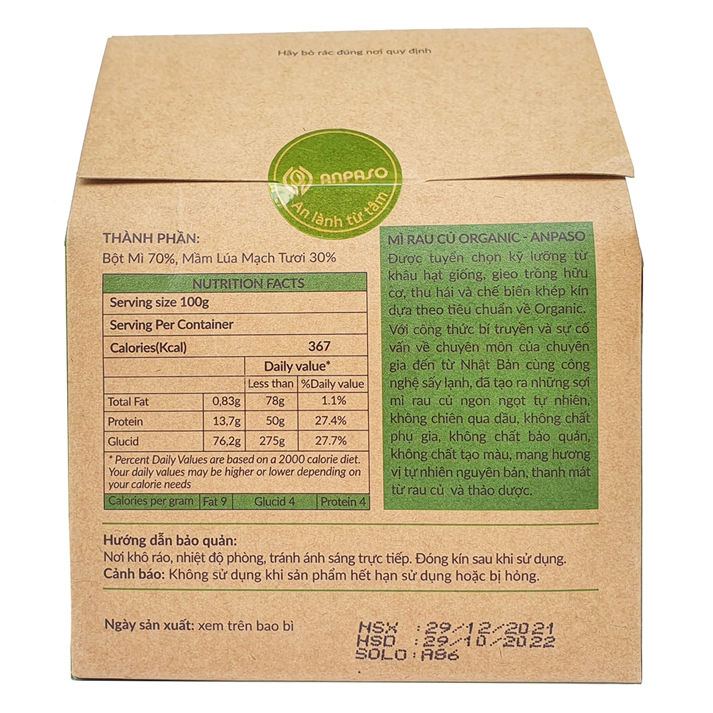 | Thành phần | Bột mì (80%), mầm lúa mạch (20%), rau tươi nghiền và bột rau |