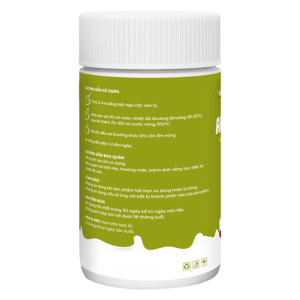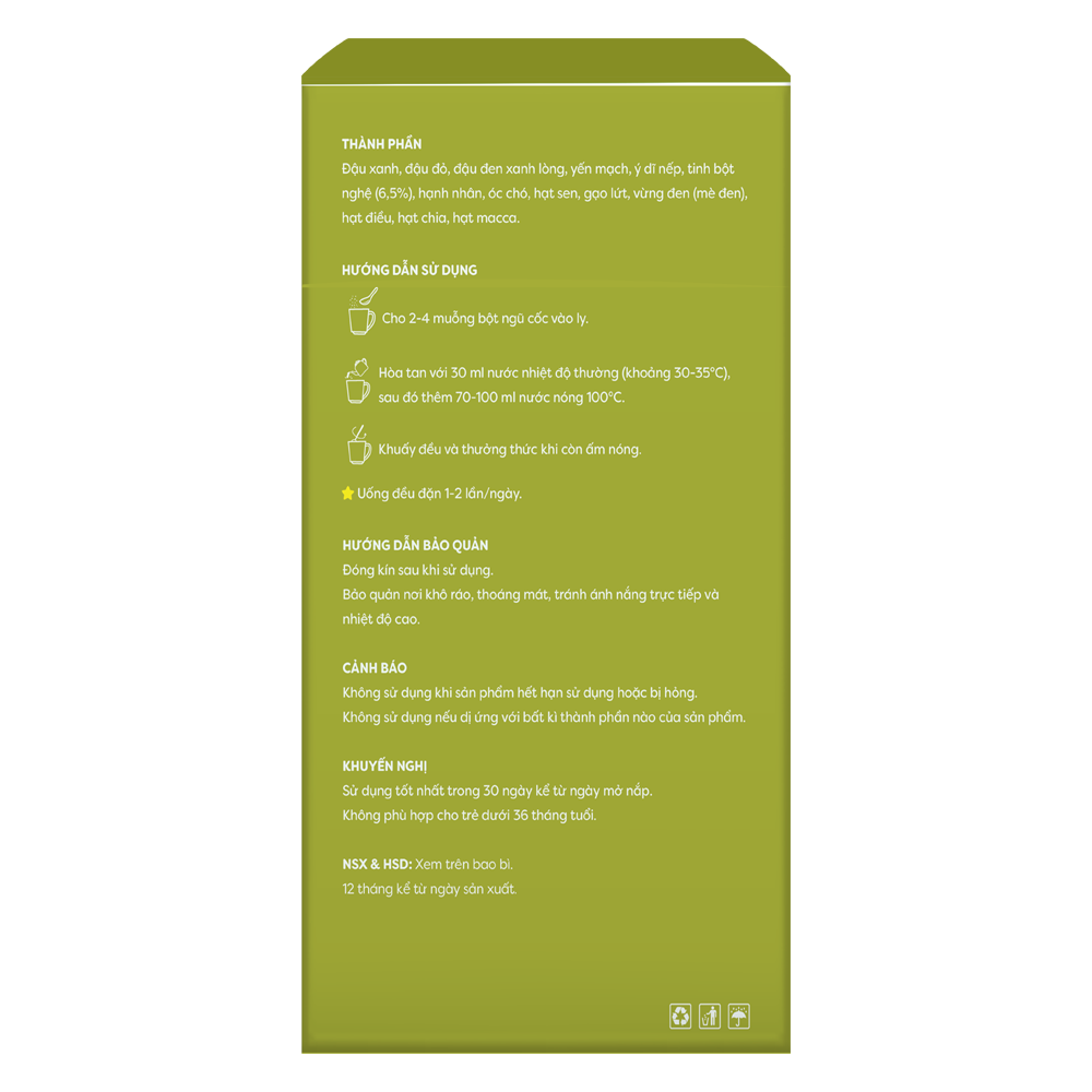 Thành phần | Đậu xanh, đậu đỏ, đậu đen xanh lòng, yến mạch, ý dĩ nếp, tinh bột nghệ (6.5%), hạnh nhân, óc chó, hạt sen, gạo lứt, vừng đen ( mè đen), hạt điều, hạt chia, hạt macca |