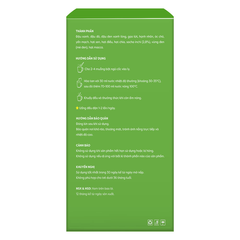| Thành phần | Đậu xanh, đậu đỏ, đậu đen xanh lòng, gạo lứt, hạnh nhân, óc chó, yến mạch, hạt sen, hạt điều, hạt chia, sacha inchi (2.8%), vừng đen ( mè đen), hạt macca |