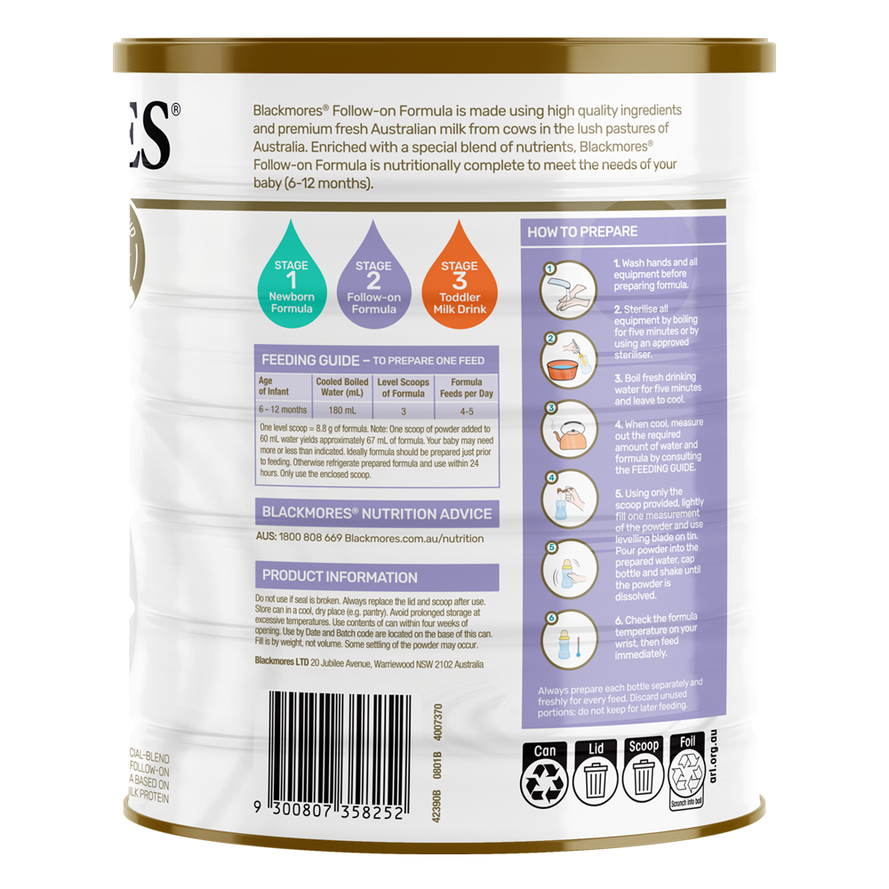 | Tên sản phẩm | Sản phẩm dinh dưỡng công thức với mục đích ăn bổ sung cho trẻ từ 6 đến 12 tháng tuổi Blackmores Follow - on Formula |