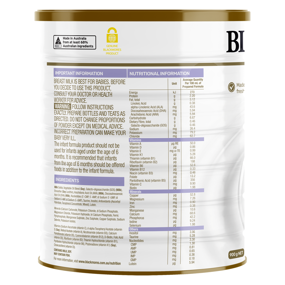 | Nhà sản xuất | Blackmores Ltd 20 đại lộ Jubilee Warriewood NSW 2102, Úc; được sản xuất và đóng gói bởi Saputo Dairy Australia, địa chỉ: số 7-9 đường Schubert, Cobram, VIC 3644, Úc (EST#6439) |
