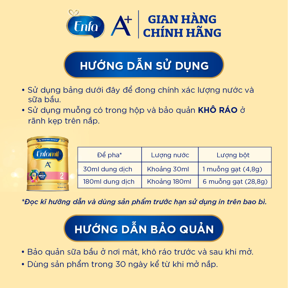 | Hướng dẫn sử dụng | - Rửa tay sạch với xà phòng và nước trước khi pha. - Tiệt trùng các dụng cụ pha cho bé.- Đun nước sôi và để nguội đến nhiệt độ phòng (không quá 40 độ C).- Cho lượng nước cần pha vào cốc sau đó cho Enfamil A+ 2 vào. - Đậy nắp dụng cụ và lắc đều. |
