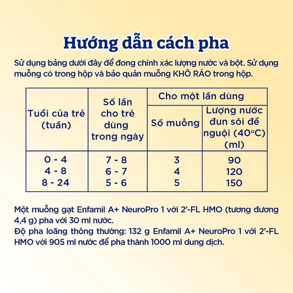 | Hướng dẫn bảo quản | . Bảo quản hộp sữa bột Enfagrow A+ NeuroPro ở nơi thoáng mát, khô ráo trước và sau khi mở. . Sau khi mở, đóng chặt nắp để đảm bảo chất lượng sản phẩm. . Nên sử dụng sản phẩm trong vòng 1 tháng kể từ lần mở hộp đầu tiên. Lưu ý Sữa mẹ là thức ăn tốt nhất cho sức khỏe và sự phát triển toàn diện của trẻ nhỏ. Các yếu tố chống nhiễm khuẩn, đặc biệt là kháng thể chỉ có trong sữa mẹ có tác dụng giúp trẻ phòng, chống bệnh tiêu chảy, nhiễm khuẩn đường hô hấp và một số bệnh nhiễm khuẩn khác. Chỉ sử dụng sản phẩm này theo hướng dẫn của bác sĩ. Pha chế theo đúng hướng dẫn. Cho trẻ ăn bằng cốc, thìa hợp vệ sinh. |