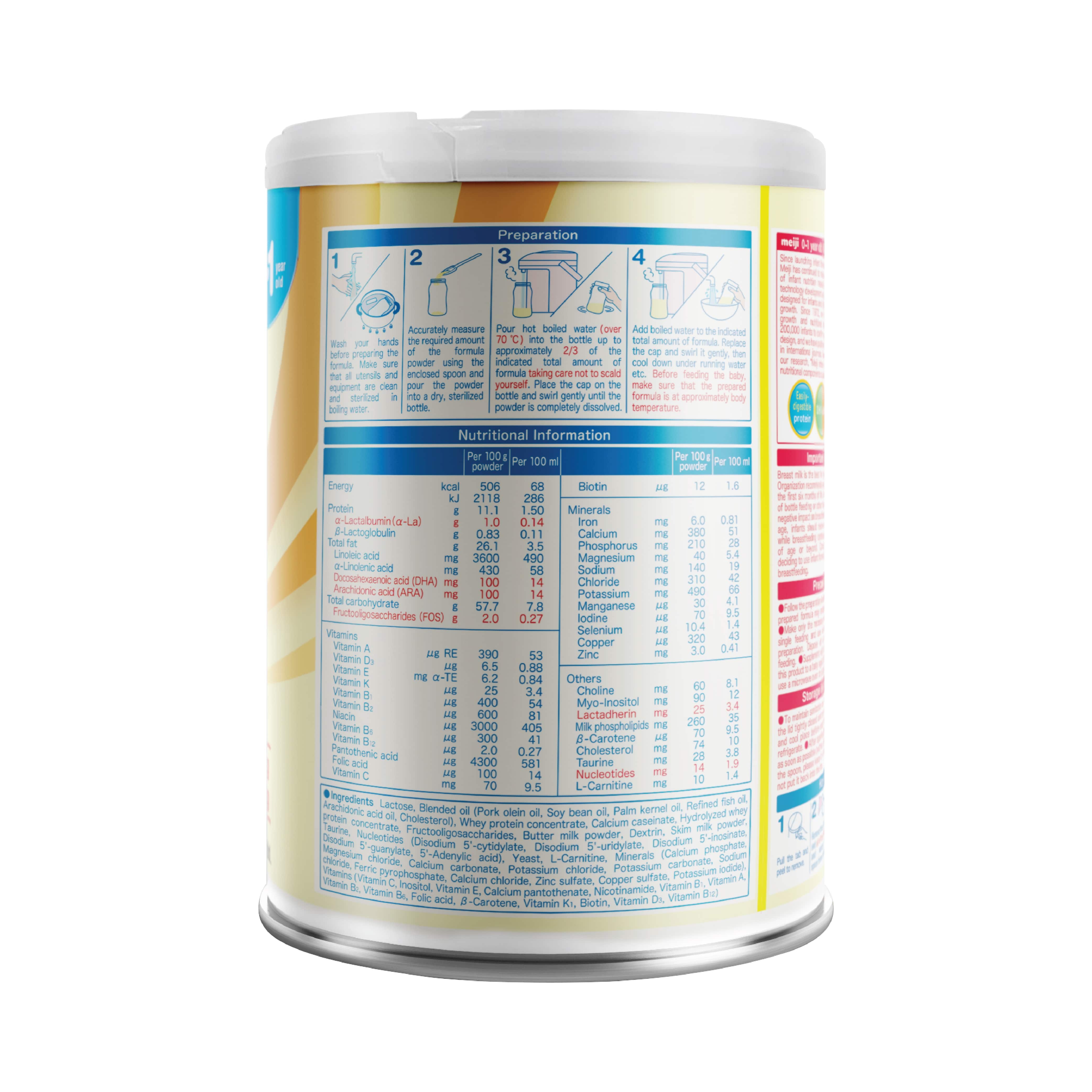 Lactose, chất béo tổng hợp (mỡ heo, dầu đậu nành, dầu dừa, dầu cá tinh luyện, axit arachidonic, cholesterol), đạm whey cô đặc, canxi caseinat, đạm whey khử khoáng cô đặc, fructooligosaccharides, bột buttermilk, bột sữa tách béo, canxi photphat, magie clorua, canxi cacbonat, kali clorua, kali cacbonat, vitamin C, inositol, natri clorua, taurine, ferric pyrophotphat, canxi clorua, vitamin E, kẽm sunfat, disodium 5'-guanylate, 5'-adenylic acid, đồng sunfat, vitamin A, vitamin B1, vitamin B2, vitamin B6, β-Carotene, axit folic, mangan sunfat, kali iotua, vitamin K1, biotin, vitamin D3, natri selenit, vitamin B12.