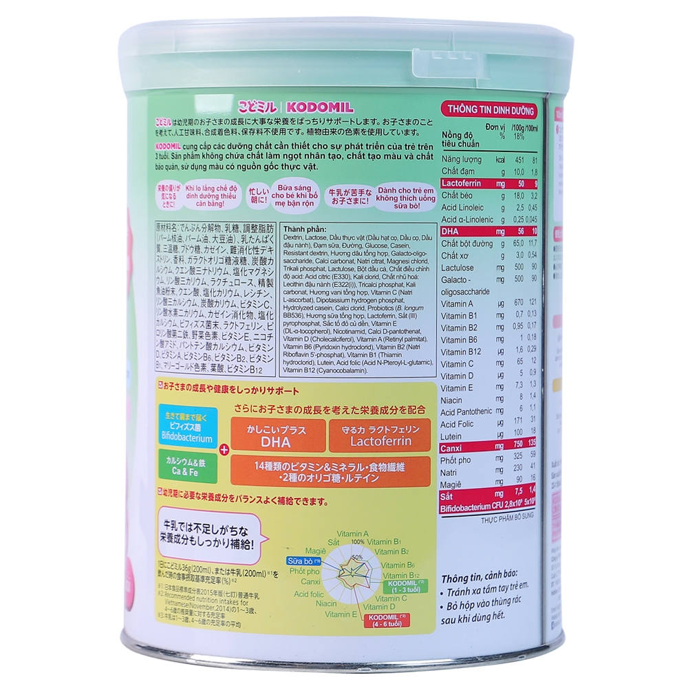 | Hướng dẫn sử dụng | Cho 3 muỗng gạt ngang (18g) bột Kodomil vào ly bằng cách sử dụng muỗng chuyên dụng đi kèm trong hộp. Thêm 90ml nước đun sôi để nguội hoặc nước ấm ở nhiệt độ 40 - 50 độ C vào ly khuấy đều cho đến khi tan hết. |