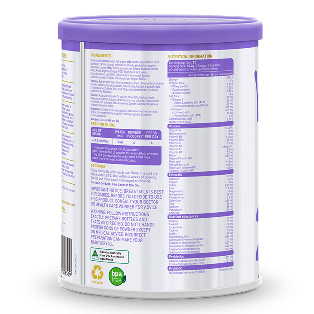 Bột whey khử khoáng, Sữa bột nguyên kem, Hỗn hợp các loại dầu thực vật (gồm Hướng dương, Cải dầu, Dừa, Hướng dương Oleic cao, Chất nhũ hóa: Lecithin Đậu nành, Ascorbyl palmitate), Lactose, Whey protein cô đặc, Galacto- oligosaccharide (GOS), Fructo-oligosaccharide (FOS), axit Arachidonic (ARA), axit Docosahexaenoic (DHA), Choline bitartrat, Inositol, Taurine, L-carnitine, Lutein, Probiotic Bifidobacterium longum BB536.