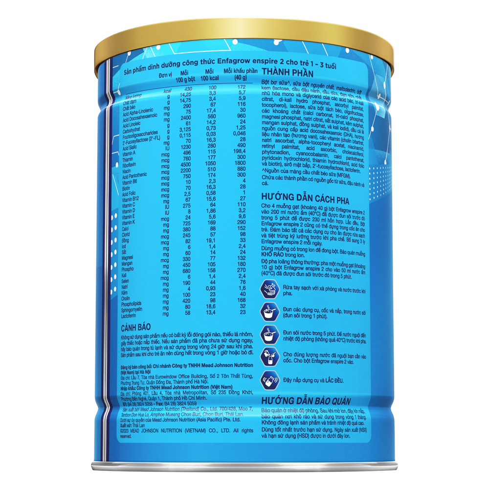| Hướng dẫn sử dụng | . Rửa tay sạch với xà phòng và nước trước khi pha. . Đun các dụng cụ, cốc và nắp, trong nước sôi (đun sôi trong 1 phút). . Đun sôi nước trong 5 phút. Để nước nguội đến nhiệt độ phòng (không quá 40oC) trước khi pha. . Cho 4 muỗng gạt (khoảng 40 g) bột Enfagrow Enspire 2 vào 200 ml nước ấm (40°C) để được 230 ml hỗn hợp. . Đậy nắp dụng cụ và LẮC ĐỀU. . Bột Enfagrow Enspire 2 cũng có thể đựng trong cốc ăn cho trẻ. Đảm bảo tất cả các dụng cụ cho ăn được rửa sạch và tiệt trùng kỹ lưỡng trước khi pha chế. Bổ sung 3 ly Enfagrow Enspire 2 mỗi ngày. . Dùng muỗng có trong lon để đong bột. Bảo quản muỗng KHÔ RÁO trong lon. . Độ pha loãng thông thường: pha một muỗng gạt (khoảng 10 g) bột Enfagrow Enspire 2 cho vào 50 ml nước ấm (40°C) đã được đun sôi trước đó trong 5 phút. |
