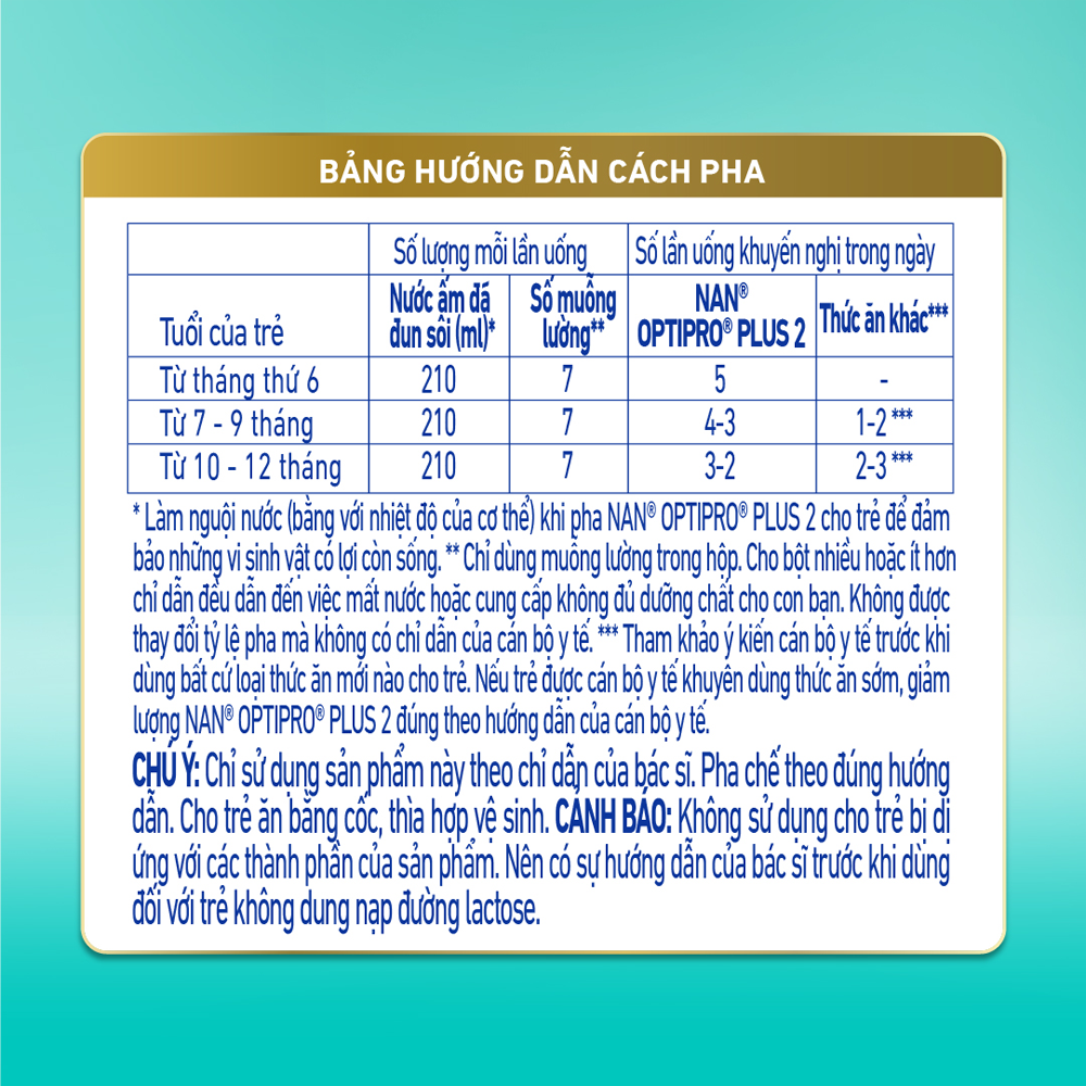 Ở tuổi này, thực đơn của trẻ trở nên đa dạng hơn (bột ngũ cốc, thức ăn dặm). Tham khảo ý kiến cán bộ y tế trước khi dùng bất cứ loại thức ăn mới nào cho trẻ. Nếu trẻ được cán bộ y tế khuyên dùng thức ăn sớm, giảm lượng NAN OPTIPRO PLUS 2 theo đúng hướng dẫn của cán bộ y tế.