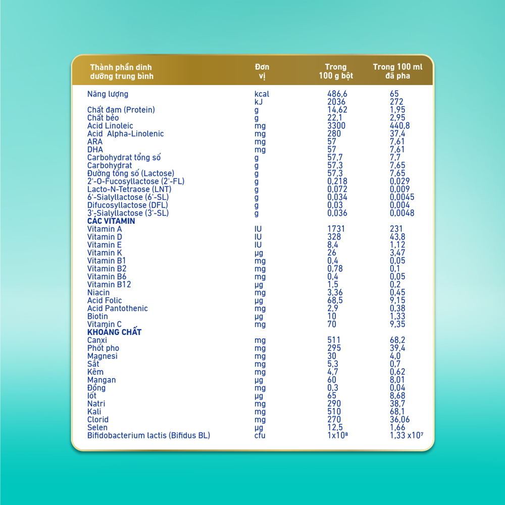 SỮA tách kem (MILK skimmed), LACTOSE (từ SỮA- MILK), ĐẠM chất lượng OPTIPRO®(ĐẠM WHEY, ĐẠM CASEIN từ SỮA-WHEY, CASEIN PROTEIN MILK), Dầu hướng dương giàu axit oleic, Dầu hạt cải có hàm lượng axit erucic thấp, Tricalci citrat, Chất nhũ hóa Lecithin ĐẬU NÀNH (SOYA lecithin), Maltodextrin, Trinatri citrat, Dầu CÁ ngừ giàu DHA (Oil FISH Tuna high DHA), 2'-Fucosyllactose (2’-FL)*, Dikali hydro phosphat, Dầu nấm giàu ARA, Natri ascorbat (Vitamin C), Lacto-N-Tetraose (LNT)*, Magnesi chlorid, Chất điều chỉnh độ acid Natri hydroxyd, Sắt (II) Sulphat, Kali citrat, 6'-Sialyllactose (6’-SL)*, Difucosyllactose (DFL)*, Kẽm sulfat, 3'-Sialyllactose (3’-SL)*, DL-alpha-tocopheryl acetat (Vitamin E), Nicotinamid, Bifidobacterium lactis (Bifidus BL), D-pantothenat calci (Vitamin B5), Đồng sulfat, Retinyl acetat (Vitamin A), Thiamin mononitrat (Vitamin B1), Pyridoxin hydroclorid (Vitamin B6), Riboflavin (Vitamin B2), Mangan sulfat, Axit folic, Kali iodid, Phytomenadion (Vitamin K1), Natri selenat, D-biotin (Vitamin B7), Cholecalciferol (Vitamin D3), Cyanocobalamin (Vitamin B12).