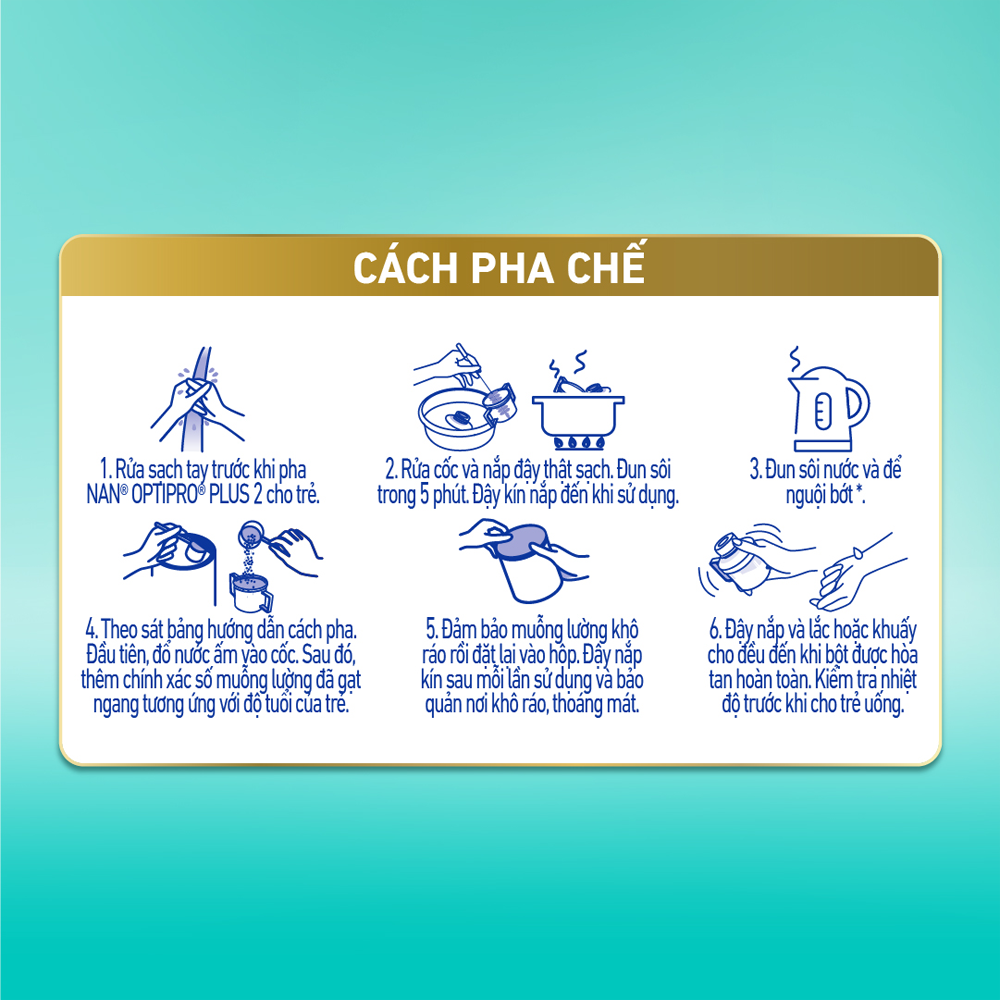 | Hướng dẫn sử dụng | . Rửa sạch tay trước khi pha NAN OPTIPRO PLUS cho trẻ . Rửa cốc và nắp đậy thật sạch. Đun sôi trong 5 phút. Đậy kín nắp đến khi sử dụng. . Đun sôi nước và để nguội bớt bằng với nhiệt độ của cơ thể. . Theo sát bảng hướng dẫn cách pha trên bao bì. Đầu tiên, đổ nước ấm vào cốc. Sau đó, thêm chính xác số muỗng lường đã gạt ngang tương ứng với độ tuổi của trẻ. . Đảm bảo muỗng lường khô ráo rồi đặt lại vào hộp. Đậy nắp kín sau mỗi lần sử dụng và bảo quản nơi khô ráo, thoáng mát. . Đậy nắp và lắc hoặc khuấy cho đều đến khi bột được hòa tan hoàn toàn. Kiểm tra nhiệt độ trước khi cho trẻ uống. Chú ý: . Nước phải được đun sôi và làm nguội lại bằng với nhiệt độ của cơ thể để đảm bảo những vi sinh vật có lợi còn sống. . Dụng cụ pha chế phải được luộc kỹ. . Chỉ dùng muỗng lường trong hộp. Cho bột nhiều hơn hoạt ít hơn chỉ dẫn đều dẫn đến việc mất nước hoặc cung cấp không đủ dưỡng chất cho con bạn. Không được thay đổi tỷ lệ pha mà không có chỉ dẫn của cán bộ y tế. Chỉ pha chế mỗi lần một cốc và cho trẻ uống ngay (luôn bồng trẻ khi cho uống để tránh sặc), không giữ lại phần thừa. Bảo quản, pha chế và cho trẻ uống không đúng cách có thể dẫn đến những tác dụng không mong muốn cho sức khỏe của trẻ. Việc bú mẹ cần được duy trì càng lâu càng tốt. |