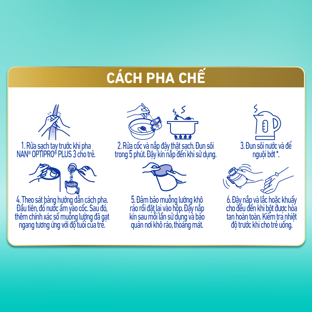 | Hướng dẫn sử dụng | . Rửa sạch tay trước khi pha NAN OPTIPRO PLUS cho trẻ . Rửa cốc và nắp đậy thật sạch. Đun sôi trong 5 phút. Đậy kín nắp đến khi sử dụng. . Đun sôi nước và để nguội bớt bằng với nhiệt độ của cơ thể. . Theo sát bảng hướng dẫn cách pha trên bao bì. Đầu tiên, đổ nước ấm vào cốc. Sau đó, thêm chính xác số muỗng lường đã gạt ngang tương ứng với độ tuổi của trẻ. . Đảm bảo muỗng lường khô ráo rồi đặt lại vào hộp. Đậy nắp kín sau mỗi lần sử dụng và bảo quản nơi khô ráo, thoáng mát. . Đậy nắp và lắc hoặc khuấy cho đều đến khi bột được hòa tan hoàn toàn. Kiểm tra nhiệt độ trước khi cho trẻ uống. Chú ý: . Nước phải được đun sôi và làm nguội lại bằng với nhiệt độ của cơ thể để đảm bảo những vi sinh vật có lợi còn sống. . Dụng cụ pha chế phải được luộc kỹ. . Chỉ dùng muỗng lường trong hộp. Cho bột nhiều hơn hoạt ít hơn chỉ dẫn đều dẫn đến việc mất nước hoặc cung cấp không đủ dưỡng chất cho con bạn. Không được thay đổi tỷ lệ pha mà không có chỉ dẫn của cán bộ y tế. Chỉ pha chế mỗi lần một cốc và cho trẻ uống ngay (luôn bồng trẻ khi cho uống để tránh sặc), không giữ lại phần thừa. Bảo quản, pha chế và cho trẻ uống không đúng cách có thể dẫn đến những tác dụng không mong muốn cho sức khỏe của trẻ. Việc bú mẹ cần được duy trì càng lâu càng tốt. |