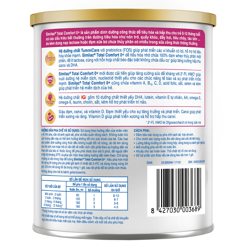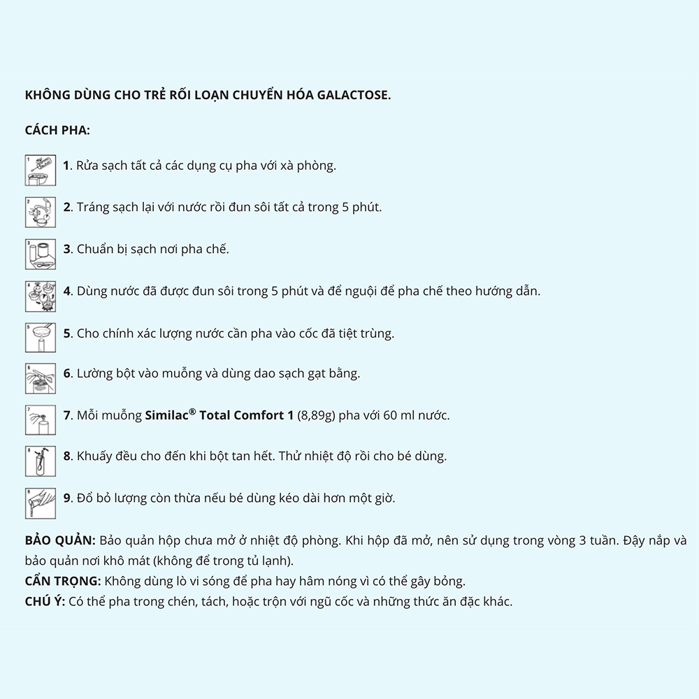 | Hướng dẫn sử dụng | Sử dụng theo hướng dẫn của nhân viên y tế. Khi pha, cần vệ sinh sạch sẽ, pha và bảo quản đúng cách. Không tuân thủ các hướng dẫn này có thể ảnh hưởng không tốt cho sức khỏe của bé. Các loại sản phẩm dinh dưỡng công thức đều không tuyệt đối vô trùng, do đó khi dùng cho trẻ sinh non hoặc trẻ có vấn đề về miễn dịch cần phải theo sự hướng dẫn và theo dõi của bác sĩ. Nước dùng để pha phải được đung sôi 5 phút, để nguội đến nhiệt độ 37 độ C và pha cẩn thận theo bảng hướng dẫn kèm theo. Chỉ dùng muỗng có sẵn trong hộp để lường Similac Total Comfort 0+. Nếu pha hơn một lần dùng thì lượng pha dư phải giữ lạnh ở nhiệt độ 2-4 độ C và dùng trong vòng 24 giờ. Chỉ cho trẻ dùng tối đa trong vòng 1 giờ, sau đó phải đổ bỏ phần còn thừa.Không dùng cho trẻ bị bệnh galactosemia. |