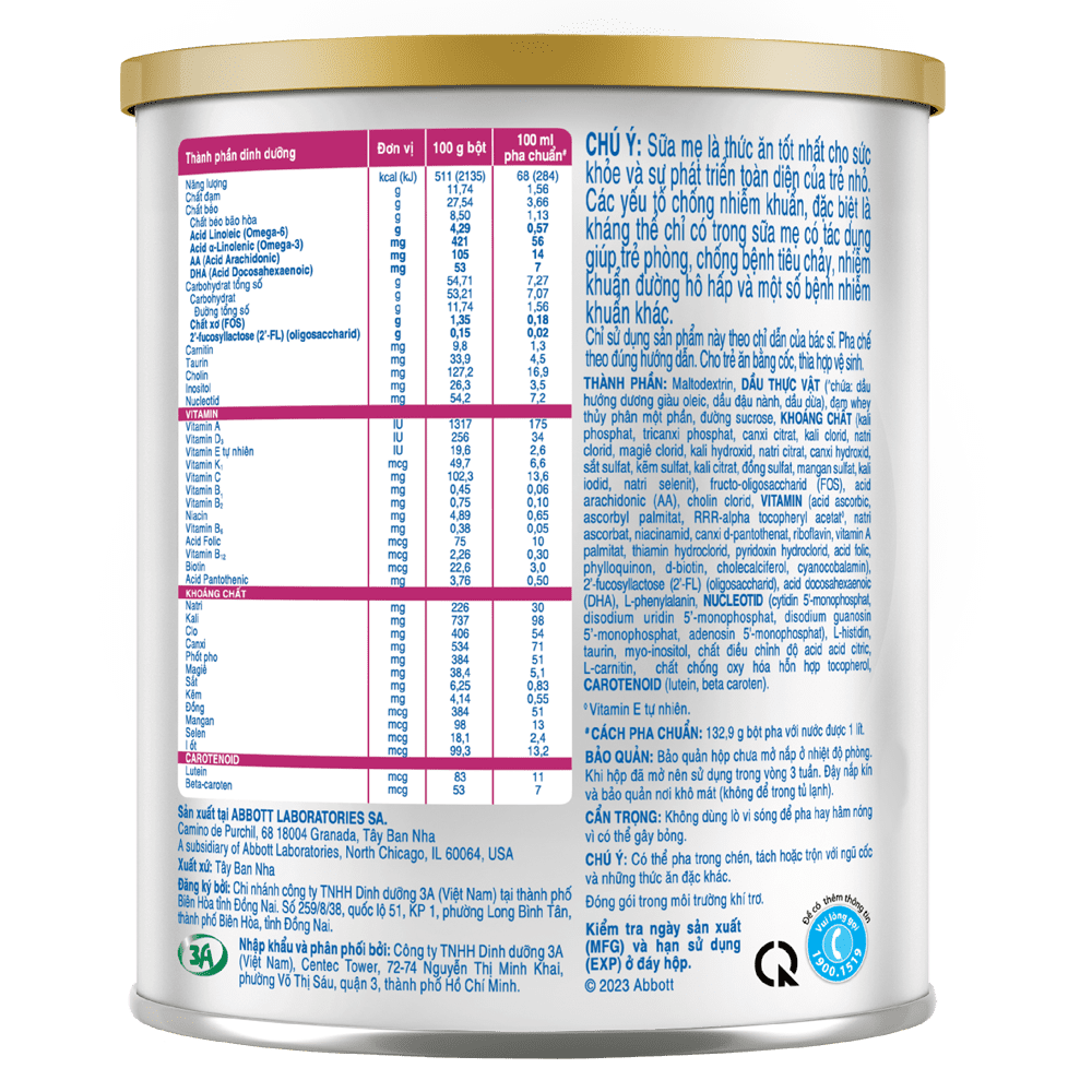 | Thành phần | Maltodextrin, DẦU THỰC VẬT (chứa: dầu hướng dương giàu oleic, dầu đậu nành, dầu dừa), đạm whey thủy phân một phần, đường sucrose, KHOÁNG CHẤT (kali phosphat, tricanxi phosphat, canxi citrat, kali clorid, natri clorid, magiê clorid, kali hydroxid, natri citrat, canxi hydroxid, sắt sulfat, kẽm sulfat, kali citrat, đồng sulfat, mangan sulfat, kali iodid, natri selenit), fructo-oligosaccharid (FOS), acid arachidonic (AA), cholin clorid, VITAMIN (acid ascorbic, ascorbyl palmitat, RRR-alpha tocopheryl acetat, natri ascorbat, niacinamid, canxi d-pantothenat, riboflavin, vitamin A palmitat, thiamin hydroclorid, pyridoxin hydroclorid, acid folic, phylloquinon, d-biotin, cholecalciferol, cyanocobalamin), 2'-fucosyllactose (2'-FL) (oligosaccharid), acid docosahexaenoic (DHA), L-phenylalanin, NUCLEOTID (cytidin 5'-monophosphat, disodium uridin 5'-monophosphat, disodium guanosin 5'-monophosphat, adenosin 5'-monophosphat), L-histidin, taurin, myo-inositol, chất chống oxy hóa hỗn hợp tocopherol, CAROTENOID (lutein, beta caroten). |