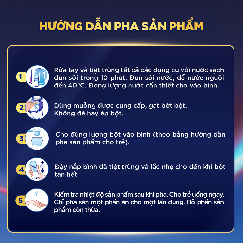 | Hướng dẫn sử dụng | Bước 1: Rửa tay và tiệt trùng tất cả các dụng cụ với nước sạch đun sôi trong 10 phút. Đun sôi nước, để nước nguội đến 40°C. Đong lượng nước cần thiết cho vào bình. Bước 2: Dùng muỗng được cung cấp, gạt bớt bột. Không đè hay ép bột. Bước 3: Cho đúng lượng bột vào bình (theo bảng hướng dẫn pha sản phẩm cho trẻ). Bước 4: Đậy nắp bình đã tiệt trùng và lắc nhẹ cho đến khi bột tan hết. Bước 5: Kiểm tra nhiệt độ sản phẩm sau khi pha. Cho trẻ uống ngay. Chỉ pha sẵn một phần ăn cho một lần dùng. Bỏ phần sản phẩm còn thừa. |