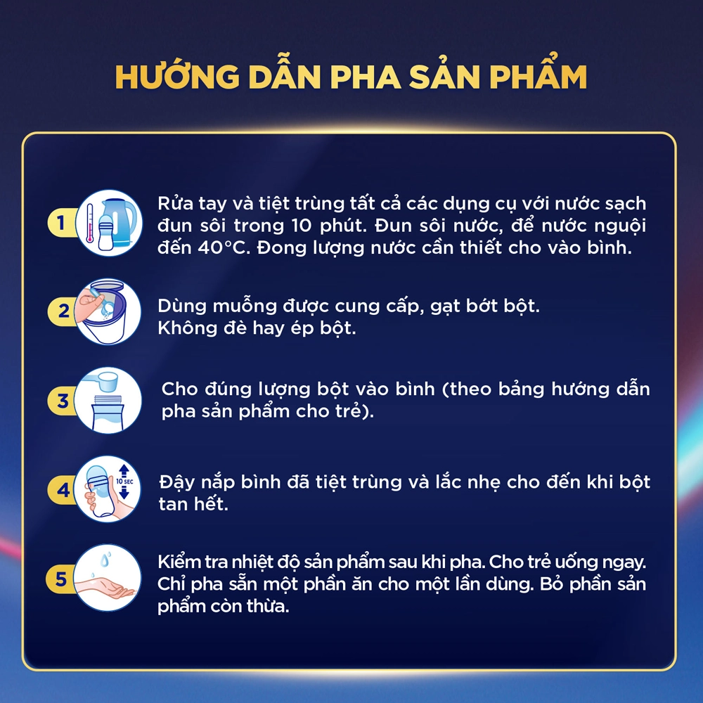 Bước 5: Kiểm tra nhiệt độ sản phẩm sau khi pha. Cho trẻ uống ngay. Chỉ pha sẵn một phần ăn cho một lần dùng. Bỏ phần sản phẩm còn thừa.
