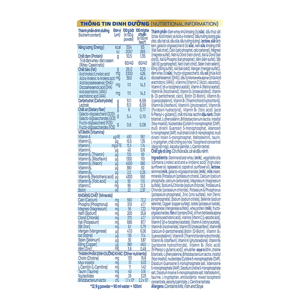 Đạm whey khử khoáng (từ sữa), dầu thực vật (chứa Acid linoleic và Acid α-linolenic) (dầu hướng dương giàu oleic, dầu hạt cải, dầu dừa, dầu hướng dương), lactose, sữa tách kem, galacto-oligosaccharid (từ sữa), kem sữa, khoáng chất {Kali (kali citrat), Calci (calci phosphat, calci carbonat), Magnesi (magnesi sulfat), Natri & Clorid (natri clorid), Kali & Clorid (kali clorid), Kali & Phospho (kali phosphat), Kẽm (kẽm sulfat), Sắt (sắt (III) pyrophosphat), Natri (natri citrat), Selen (natri selenit), Đồng (đồng sulfat), Iod (kali iodid), Mangan (mangan sulfat)}, đạm whey (từ sữa), fructo-oligosaccharid, dầu cá {chứa Acid docosahexaenoic (DHA)}, dầu từ Mortierella alpina {chứa Acid arachidonic (ARA)}, vitamins {Vitamin C (Acid L-ascorbic), Vitamin E (dl-α-tocopheryl acetat), Vitamin A (Retinyl acetat), Vitamin B3 (Nicotinamid), Vitamin D3 (cholecalciferol), Vitamin B5 (D-pantothenat, calci), Biotin (D-Biotin), Vitamin B12 (cyanocobalamin), Vitamin B1 (Thiaminchlorid hydrochlorid), Vitamin B2 (riboflavin), Vitamin K1 (phytonadion), Vitamin B6 (Pyridoxin hydroclorid), Vitamin B9 (folic acid) (acid N-Pteroyl--L-glutamic)}, chất nhũ hóa: lecithin đậu nành, Cholin bitartrat, L-phenylalanin, Bifidobacterium lactis, inositol (Myo-Inositol), Nucleotides (Cytidin 5-monophosphat (CMP), muối dinatri Guanosin 5-monophosphat, Adenosin 5-monophosphat (AMP), muối dinatri Uridin 5-monophosphat, muối dinatri Inosin 5-monophosphat, Maltodextrin), taurin, L-tryptophan, chất chống oxy hóa: Tocopherol concentrat (dạng hỗn hợp), Ascorbyl palmitat, L-Carnitin tartrat.