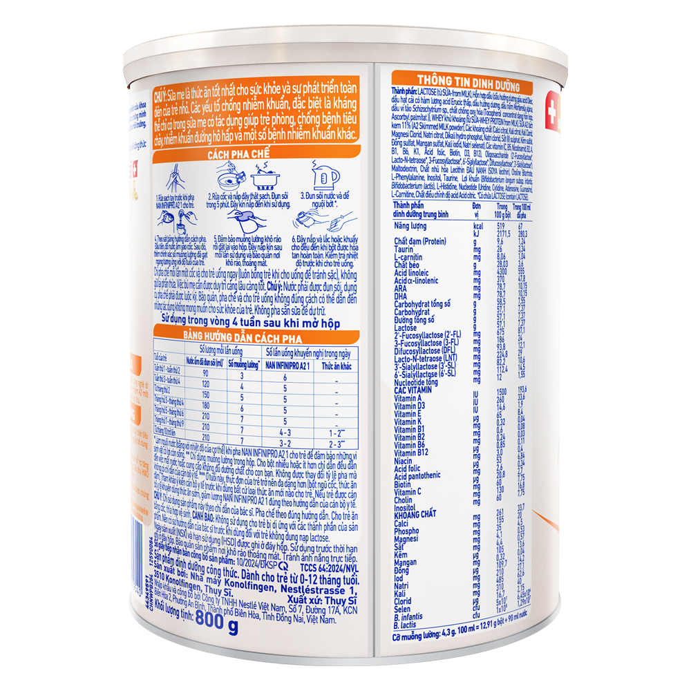 | Hướng dẫn sử dụng | Cách pha chế: 1. Rửa sạch tay trước khi pha NAN INFINIPRO A2 1 cho trẻ 2. Rửa cốc và nắp đậy thật sạch. Đun sôi trong 5 phút. Đậy kín nắp đến khi sử dụng. 3. Đun sôi nước và để nguội bớt. 4. Theo sát bảng hướng dẫn cách pha trên bao bì. Đầu tiên, đổ nước ấm vào cốc. Sau đó, thêm chính xác số muỗng lường đã gạt ngang tương ứng với độ tuổi của trẻ. 5. Đảm bảo muỗng lường khô ráo rồi đặt lại vào hộp. Đậy nắp kín sau mỗi lần sử dụng và bảo quản nơi khô ráo, thoáng mát. 6. Đậy nắp và lắc hoặc khuấy cho đều đến khi bột được hòa tan hoàn toàn. Kiểm tra nhiệt độ trước khi cho trẻ uống. Chú ý: - Nước phải được đun sôi và làm nguội lại bằng với nhiệt độ của cơ thể hoặc tối đa 45 độ C để đảm bảo những vi sinh vật có lợi còn sống. - Dụng cụ pha chế phải được luộc kỹ. - Chỉ dùng muỗng lường trong hộp. Cho bột nhiều hơn hoạt ít hơn chỉ dẫn đều dẫn đến việc mất nước hoặc cung cấp không đủ dưỡng chất cho con bạn. Không được thay đổi tỷ lệ pha mà không có chỉ dẫn của cán bộ y tế. Chỉ pha chế mỗi lần một cốc và cho trẻ uống ngay (luôn bồng trẻ khi cho uống để tránh sặc), không giữ lại phần thừa. Việc bú mẹ cần được duy trì càng lâu càng tốt. Chú ý: nước phải được đun sôi, dụng cụ pha chế phải được luộc kĩ. Bảo quản, pha chế và cho trẻ uống không đúng cách có thể dẫn đến những tác dụng không mong muốn cho sức khỏe của trẻ. Không pha sẵn để dự trữ. |