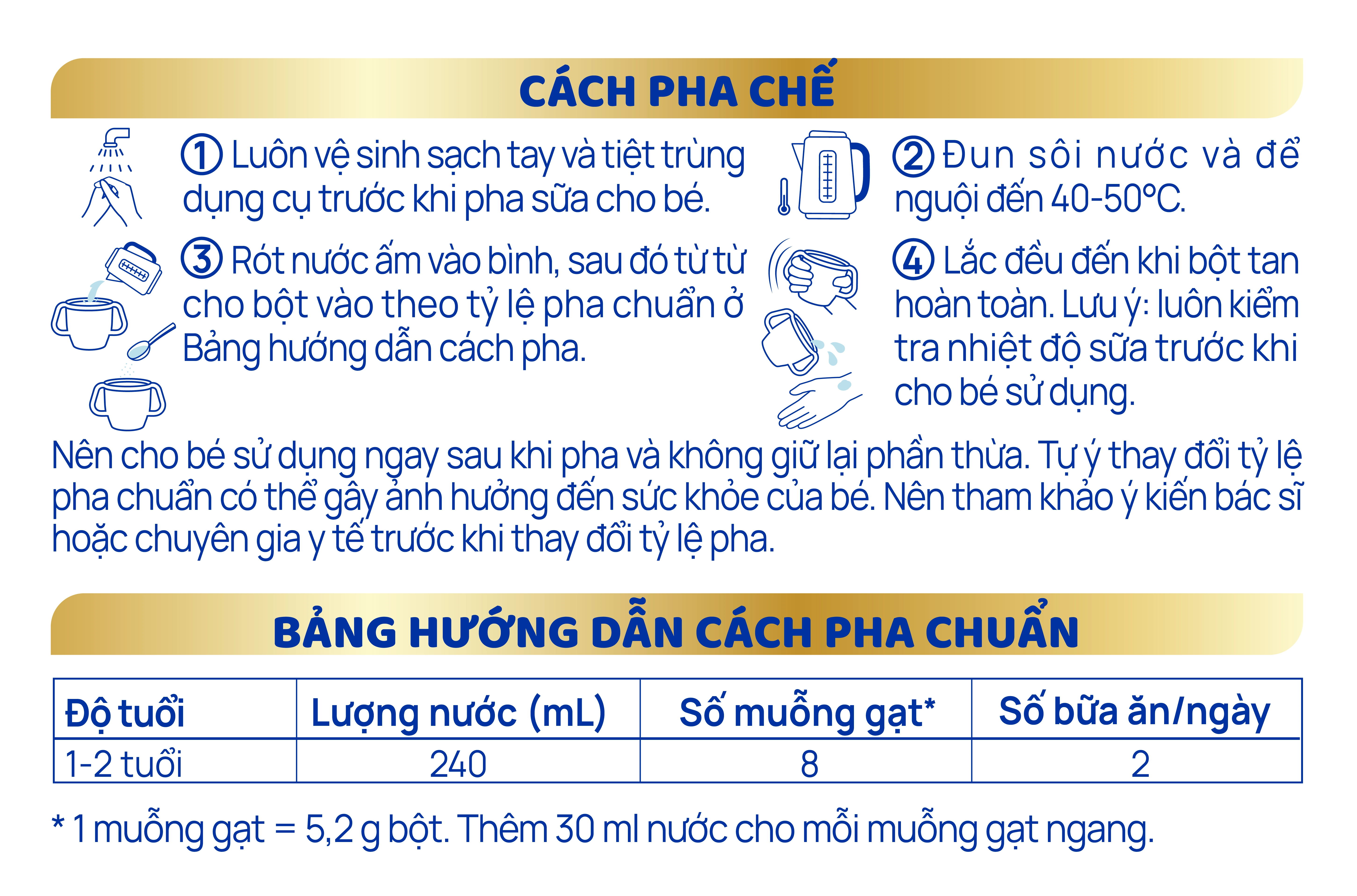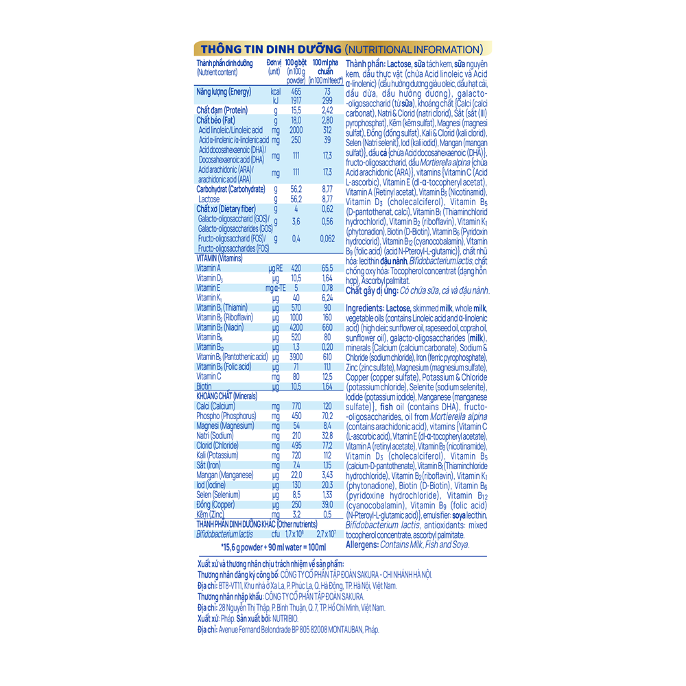 Lactose, sữa tách kem, sữa nguyên kem, dầu thực vật (chứa Acid linoleic và Acid α-linolenic) (dầu hướng dương giàu oleic, dầu hạt cải, dầu dừa, dầu hướng dương), galacto-oligosaccharid (từ sữa), khoáng chất {Calci (calci carbonat), Natri & Clorid (natri clorid), Sắt (sắt (III) pyrophosphat), Kẽm (kẽm sulfat), Magnesi (magnesi sulfat), Đồng (đồng sulfat), Kali & Clorid (kali clorid), Selen (Natri selenit), Iod (kali iodid), Mangan (mangan sulfat)}, dầu cá {chứa Acid docosahexaenoic (DHA)}, fructo-oligosaccharid, dầu Mortierella alpina {chứa Acid arachidonic (ARA)}, vitamins {Vitamin C (Acid L-ascorbic), Vitamin E (dl-α-tocopheryl acetat), Vitamin A (Retinyl acetat), Vitamin B3 (Nicotinamid), Vitamin D3 (cholecalciferol), Vitamin B5 (D-pantothenat, calci), Vitamin B1 (Thiaminchlorid hydrochlorid), Vitamin B2 (riboflavin), Vitamin K1 (phytonadion), Biotin (D-Biotin), Vitamin B6 (Pyridoxin hydroclorid), Vitamin B12 (cyanocobalamin), Vitamin B9 (folic acid) (acid N-Pteroyl-L-glutamic)}, chất nhũ hóa: lecithin đậu nành, Bifidobacterium lactis, chất chống oxy hóa: Tocopherol concentrat (dạng hỗn hợp), Ascorbyl palmitat.