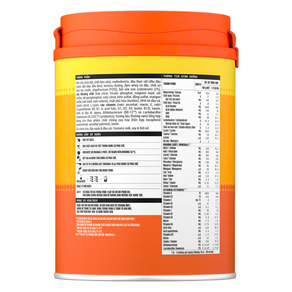 Bột sữa (sữa bột, chất béo sữa), maltodextrin,lactoza, đường, dầu thực vật (dầu đậu nành, dầu bắp, dầu dừa), chất xơ hòa tan, oligofructose (FOS), bột kem thực vật, đạm whey cô đặc (whey và whey giàu alpha-lactalbumin), đường, bột béo MCT, các khoáng chất (tricalci phosphat, kali citrat, sắt pyrophosphat, kẽm sulfat, mangan, chất nhũ hóa, DHA từ dầu cá và dầu tảo, cholin clorid, bifidobacterium & lactobacillus rahmnosus, các vitamin, taurin, hương liệu tổng hợp dùng cho thực phẩm, ARA từ dầu M.alpina, hỗn hợp nuleotid, chất chống oxy hóa, lutein, bột sữa non