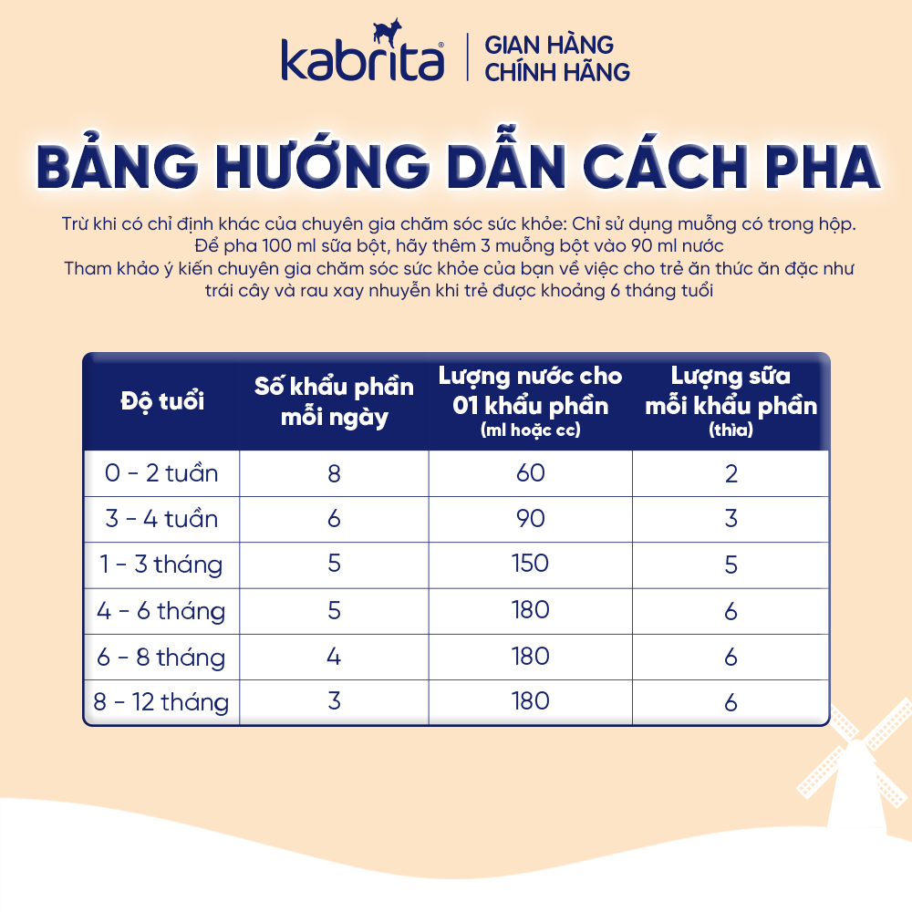 | Hướng dẫn sử dụng | Hướng dẫn vệ sinh dụng cụ pha chế và sử dụng: Chuẩn bị sữa không quá 1 giờ trước khi cho trẻ ăn. 1. Rửa tay kỹ trước khi pha sữa. 2. Khử trùng dụng cụ pha sữa theo hướng dẫn của nhà sản xuất. 3. Đổ đầy bình sữa bằng lượng nước đun sôi để nguội thích hợp không quá 30 phút đến khoảng 40 °C. 4. Thêm lượng sữa bột đã chỉ định theo bảng định lượng bên dưới vào lượng nước tương ứng. 5. Đậy nắp bình và lắc đều cho đến khi bột tan hết. 6. Kiểm tra nhiệt độ ở mặt trong cổ tay của bạn. |