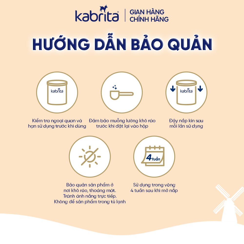 | Hướng dẫn bảo quản | • Đậy kín hộp sữa bằng nắp nhựa. • Sau khi mở: bảo quản bột sữa và muỗng trong hộp ở nơi khô ráo (không để trong tủ lạnh), tránh nhiệt độ cao, ánh sáng mặt trời chiếu trực tiếp và sử dụng tốt nhất trong vòng 04 tuần sau khi mở bao bì sản phẩm. |