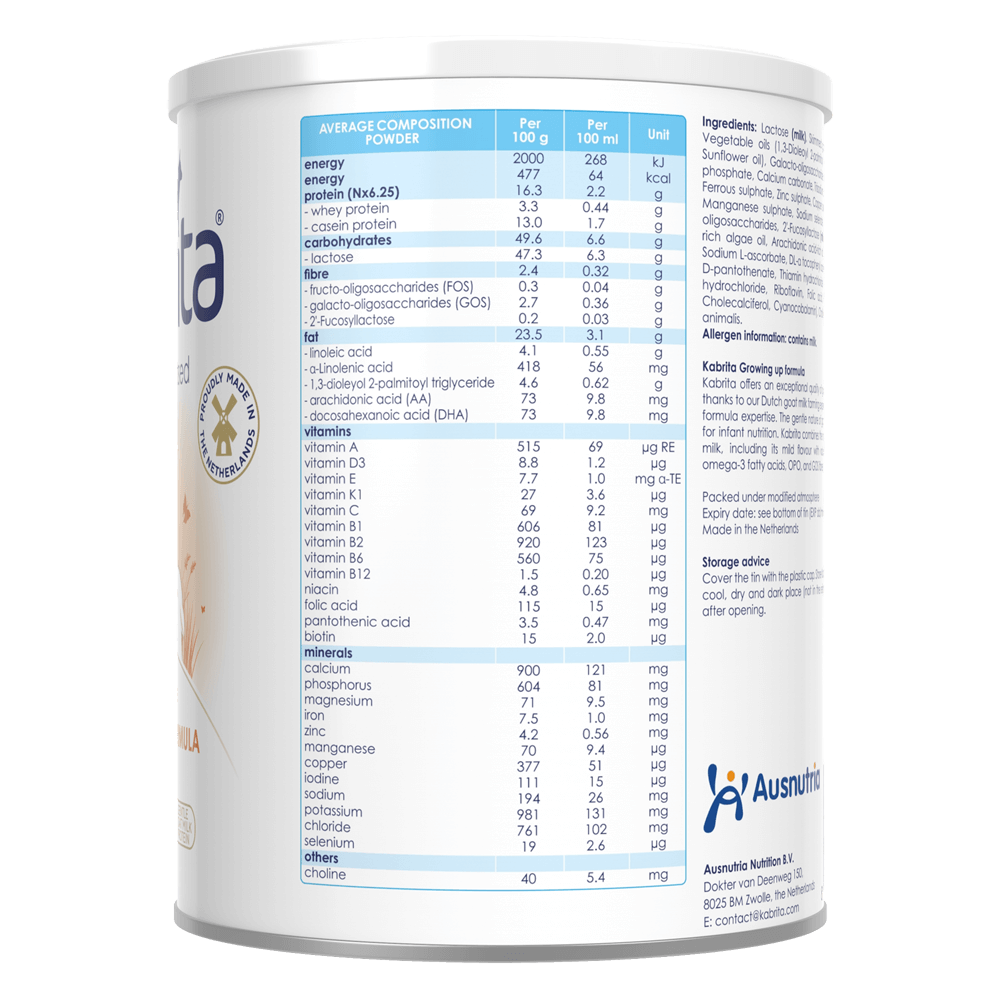 Lactose (từ sữa) 28,69%, Sữa dê tách béo 26,96%, Sữa dê nguyên kem 21,22%, Dầu thực vật (1,3-Dioleoyl 2-palmitoyl triglyceride, Dầu hạt cải, Dầu hướng dương) 17,06%, Galacto-oligosaccharides (từ sữa) 3,98%, Khoáng chất: (Các muối calci phosphat, Calci cacbonat, Natri citrat, Kali hydroxyd, Sắt (II) sulphat, Kẽm sulfat, Đồng sulfat, Magnesi chlorid, Magnesi sulphat, Natri selenit, Kali iodide), Fructo-oligosaccharides, 2'-Fucosyllactose (từ sữa), Dầu tảo giàu axit docosahexaenoic, Dầu giàu axit arachidonic, Vitamin: (Acid L-ascorbic, Natri L-ascorbat, DL-a tocopheryl acetat, Nicotianmid, Canxi D-pantothenate, Thiamin hydrochloride, Retinyl acetate, Pyridoxine hydrochloride, Riboflavin, Axit folic, Phytomenadione, D-biotin, Cholecalciferol, Cyanocobalamin), Choline bitartrate, lợi khuẩn Bifidobacterium animalis.